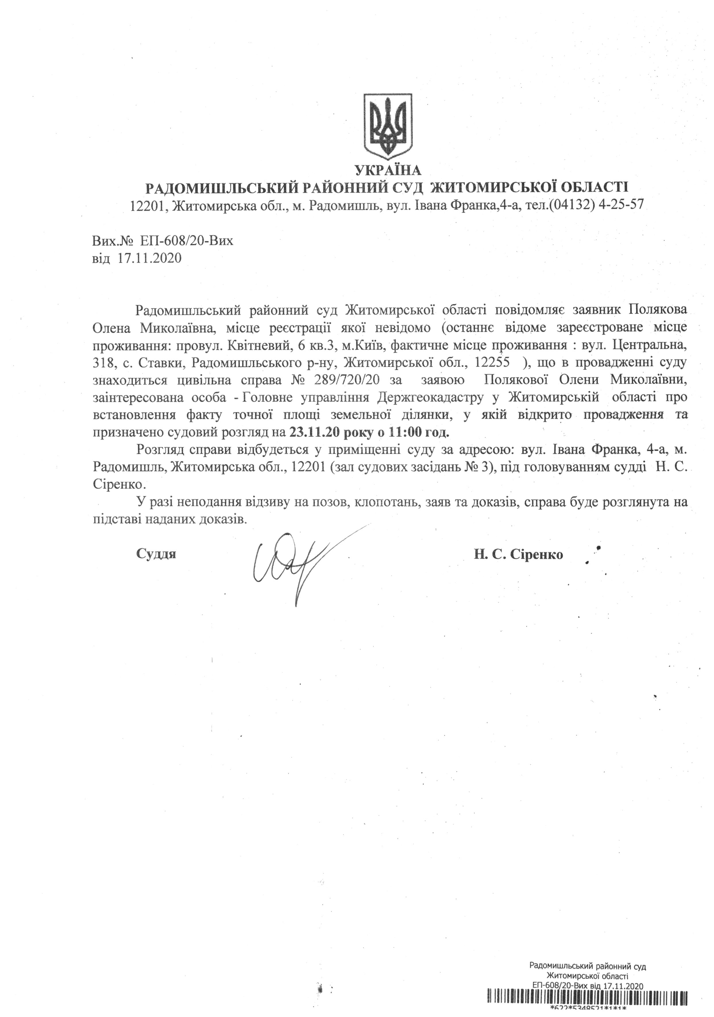 Радомишльський районний суд повідомляє Полякову Олену Миколаївну про розгляд цивільної справи № 289/720/20 за заявою Полякової Олени Миколаївни, заінтересована особа - Головне управління Держгеокадастру у Житомирській області про встановлення факту точної площі земельної ділянки
