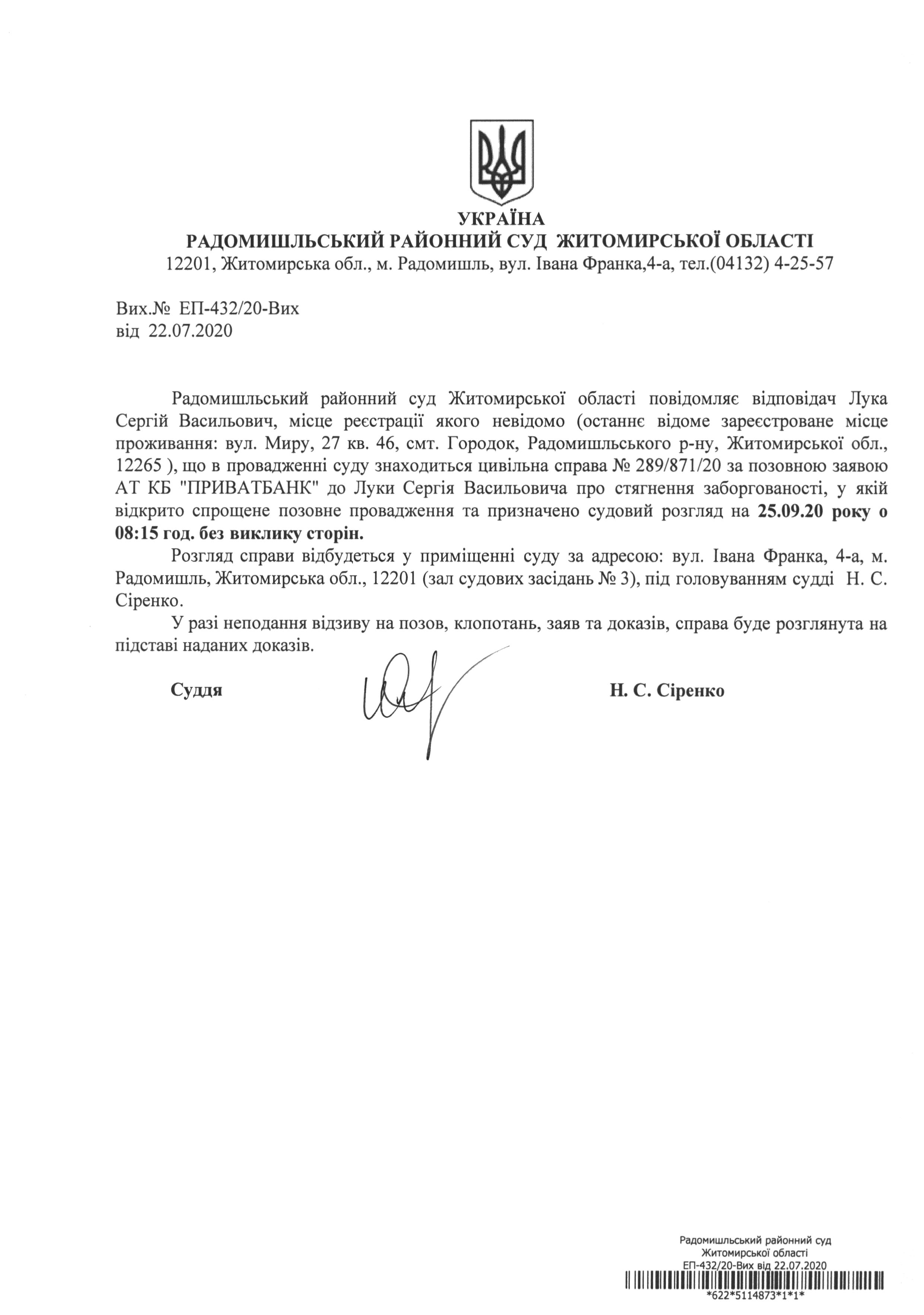 Радомишльський районний суд повідомляє Луку Сергія Васильовича про розгляд цивільної справи № 289/871/20 за позовною заявою АТ КБ "ПРИВАТБАНК" до Луки Сергія Васильовича про стягнення заборгованості