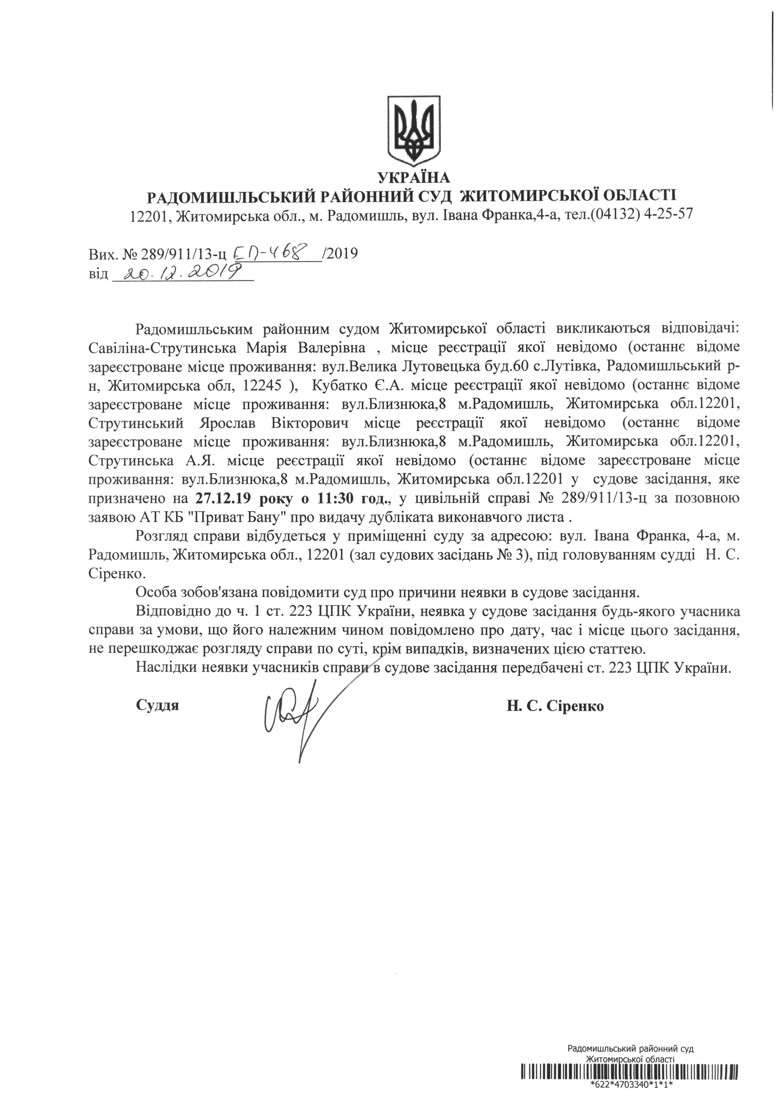 Оголошення про виклик до суду Савіліної-Струтинської Марії Валерівни, Кубатко Є.А., Струтинського Ярослава Вікторовича, Струтинської А.Я.у цивільній справі № 289/911/13-ц за позовною заявою АТ КБ "Приват Бану" про видачу дубліката виконавчого листа