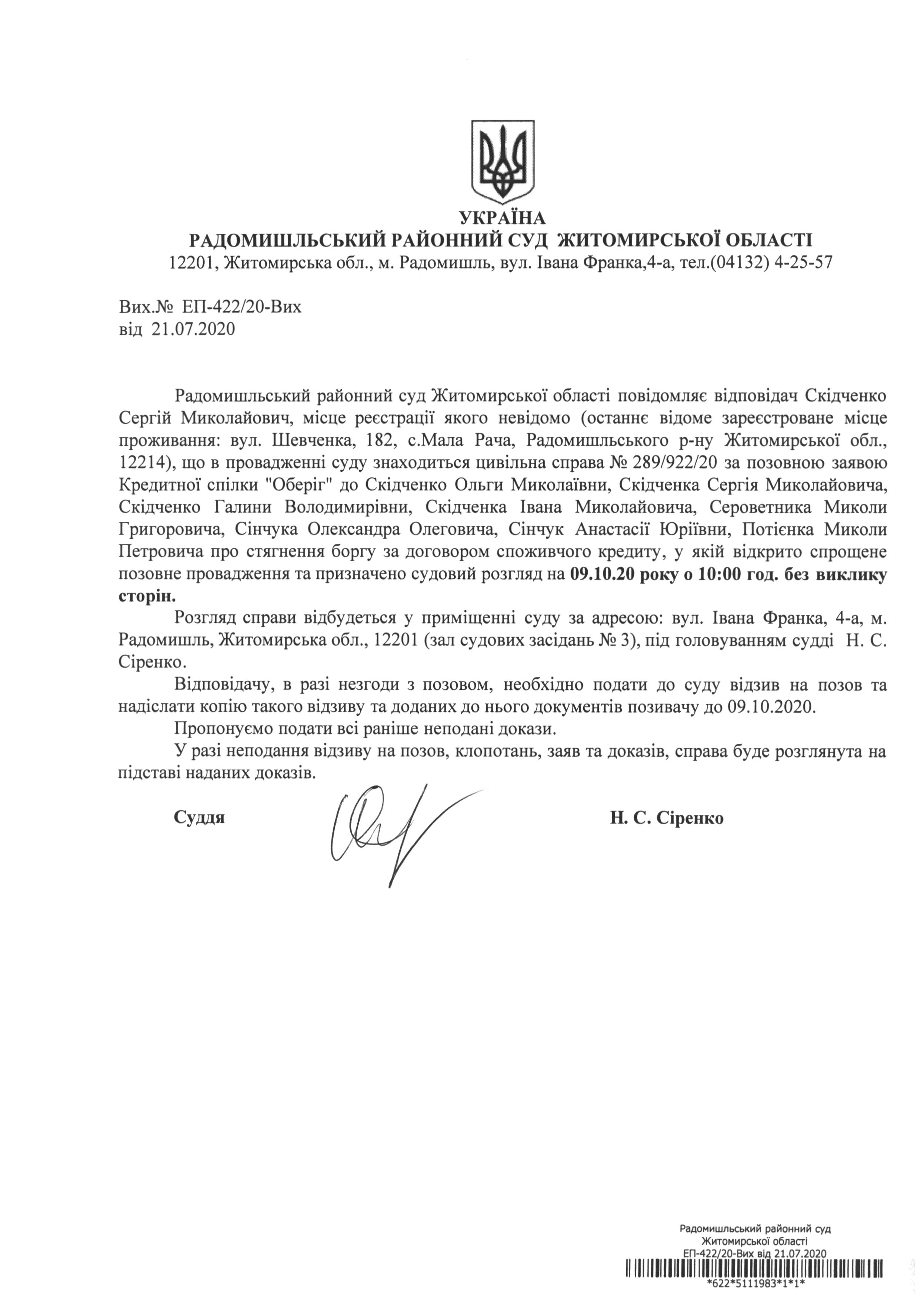Радомишльський районний суд повідомляє Скідченка Сергія Миколайовича про розгляд цивільної справи № 289/922/20 за позовною заявою Кредитної спілки "Оберіг" до Скідченко Ольги Миколаївни, Скідченка Сергія Миколайовича, Скідченко Галини Володимирівни, Скідченка Івана Миколайовича, Сероветника Миколи Григоровича, Сінчука Олександра Олеговича, Сінчук Анастасії Юріївни, Потієнка Миколи Петровича про стягнення боргу за договором споживчого кредиту