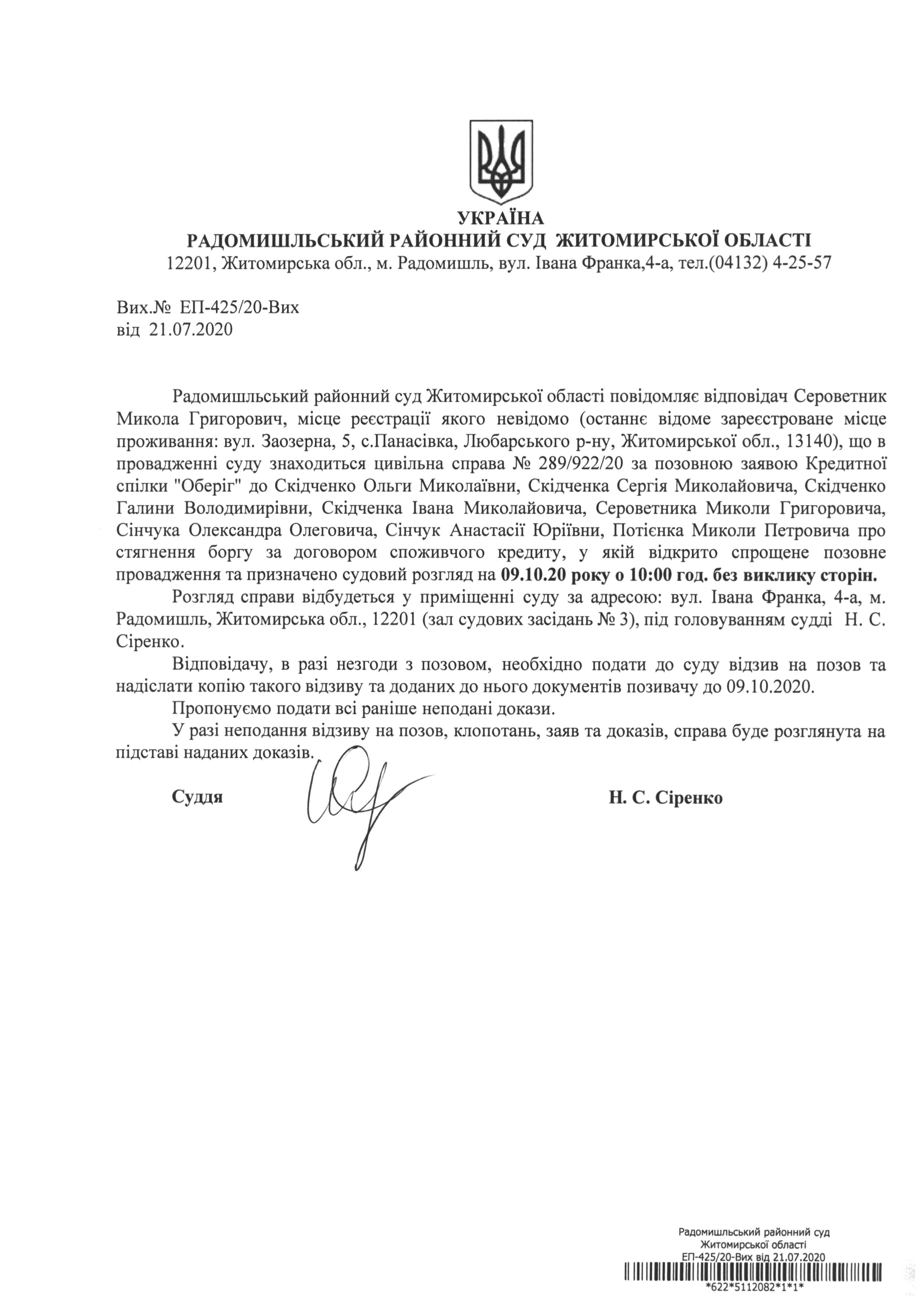 Радомишльський районний суд повідомляє Сероветника Миколу Григоровича про розгляд цивільної справи № 289/922/20 за позовною заявою Кредитної спілки "Оберіг" до Скідченко Ольги Миколаївни, Скідченка Сергія Миколайовича, Скідченко Галини Володимирівни, Скідченка Івана Миколайовича, Сероветника Миколи Григоровича, Сінчука Олександра Олеговича, Сінчук Анастасії Юріївни, Потієнка Миколи Петровича про стягнення боргу за договором споживчого кредиту