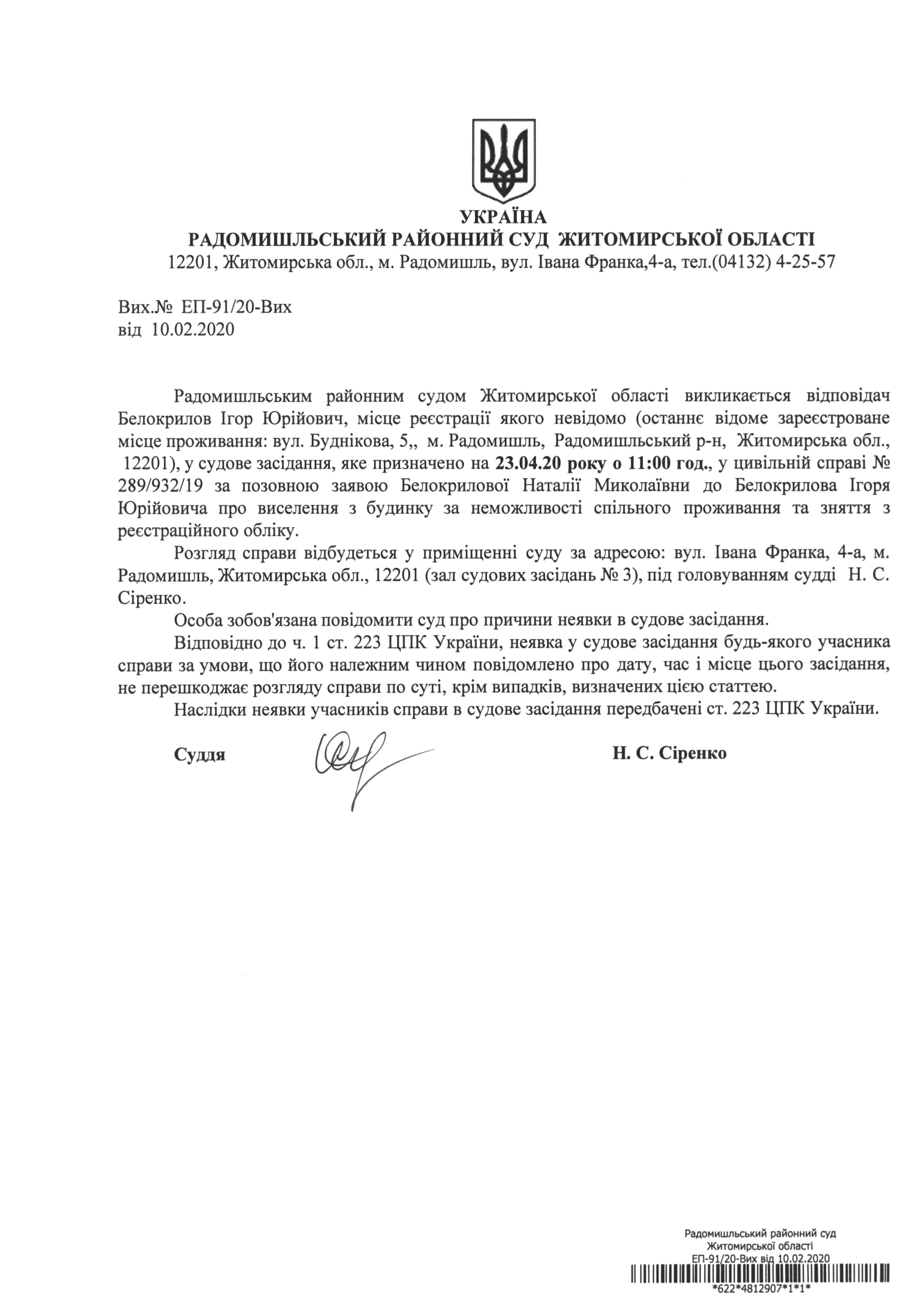 Оголошення про виклик до суду Белокрилова Ігоря Юрійовича у цивільній справі № 289/932/19 за позовною заявою Белокрилової Наталії Миколаївни до Белокрилова Ігоря Юрійовича про виселення з будинку за неможливості спільного проживання та зняття з реєстраційного обліку