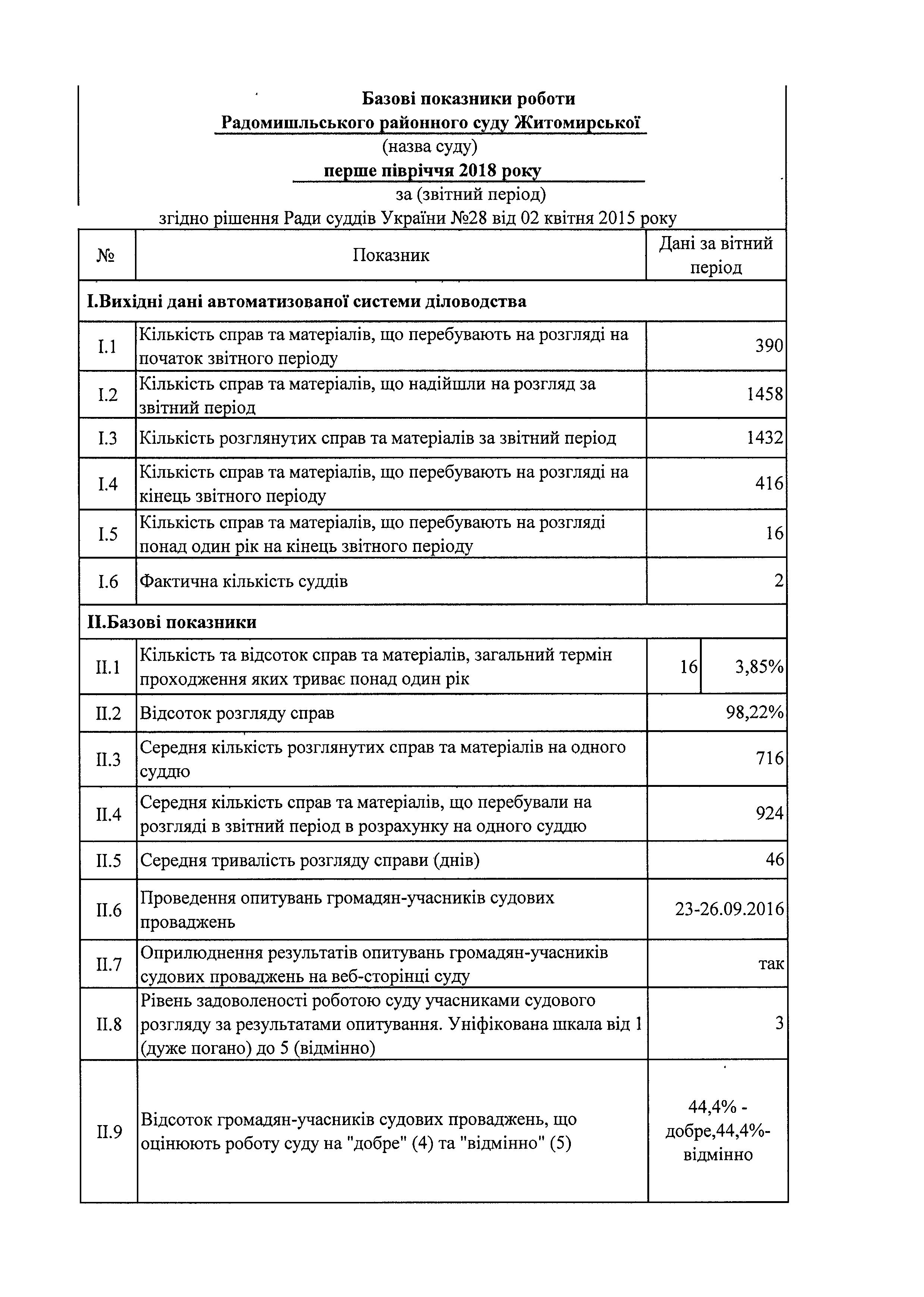 Базові показники роботи Радомишльського районного суду Житомирської області за I півріччя 2018 року