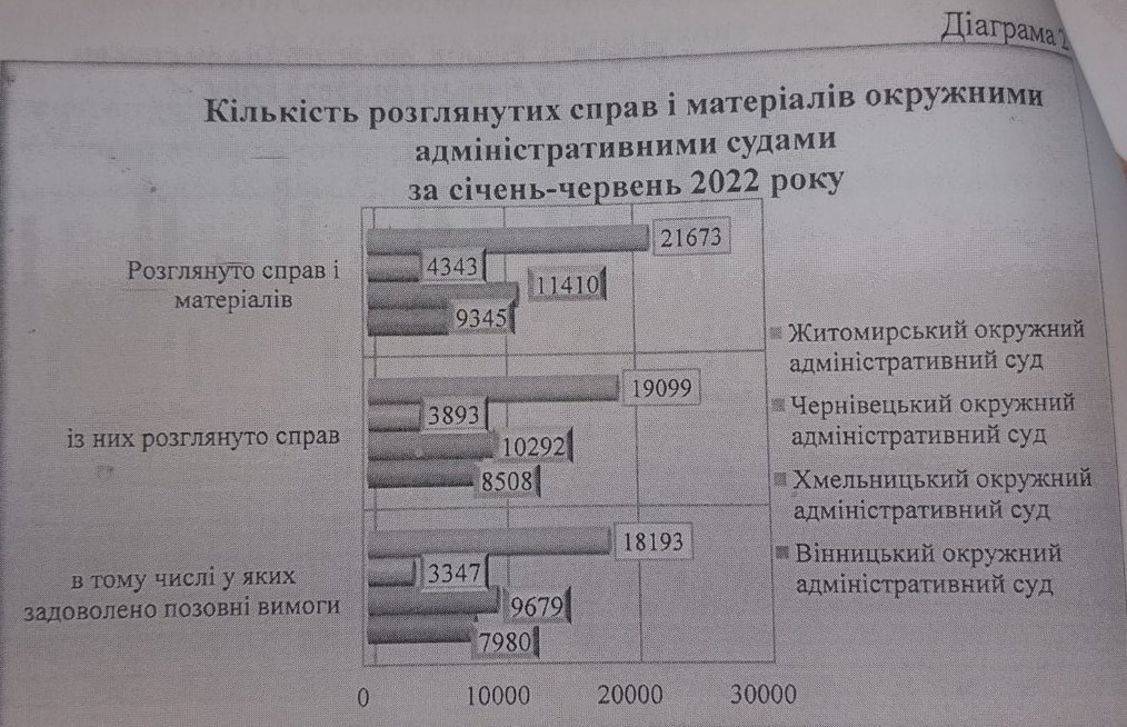 У січні-червні 2022 року суддями окружних адміністративних судів округу розглянуто 46771 справ і матеріалів, з них 21673 справ і матеріалів розглянув Житомирський окружний адміністративний суд, що у 1,2 раза більше, ніж в аналогічному періоді минулого року (18026).