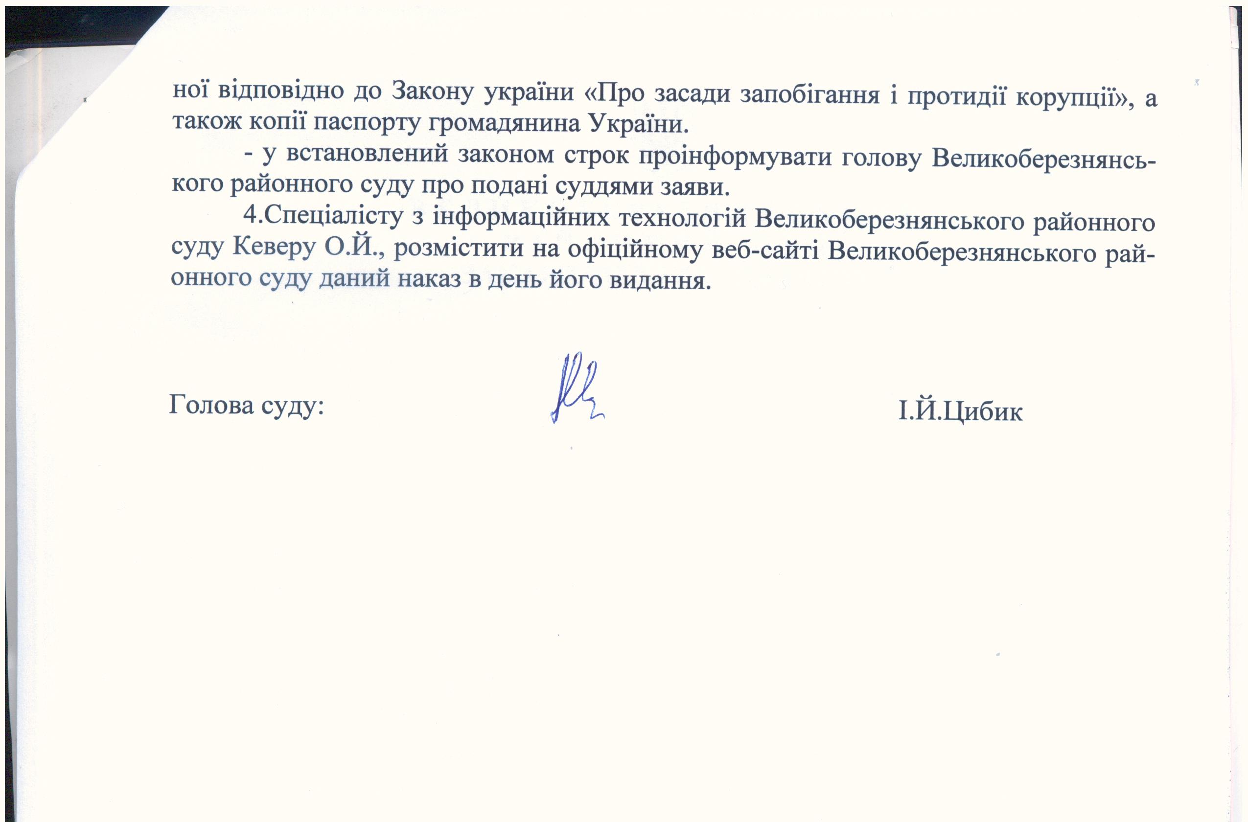 Наказ про початок проведення перевірки передбаченої Законом України «Про очищення влади» щодо суддів Великоберезнянського районного суду Закарпатської області