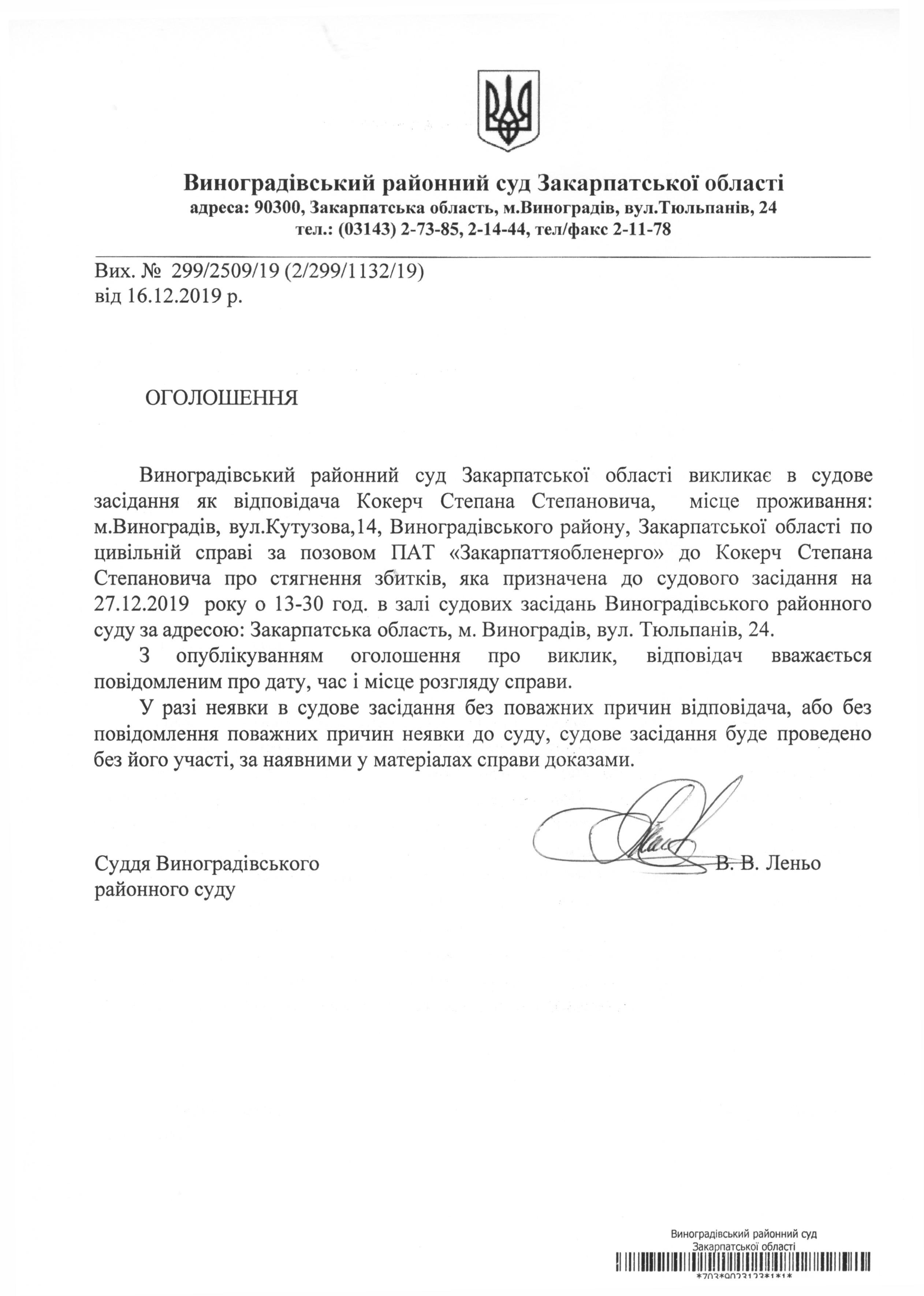 Оголошення про виклик в судове засідання Кокерч С.С.