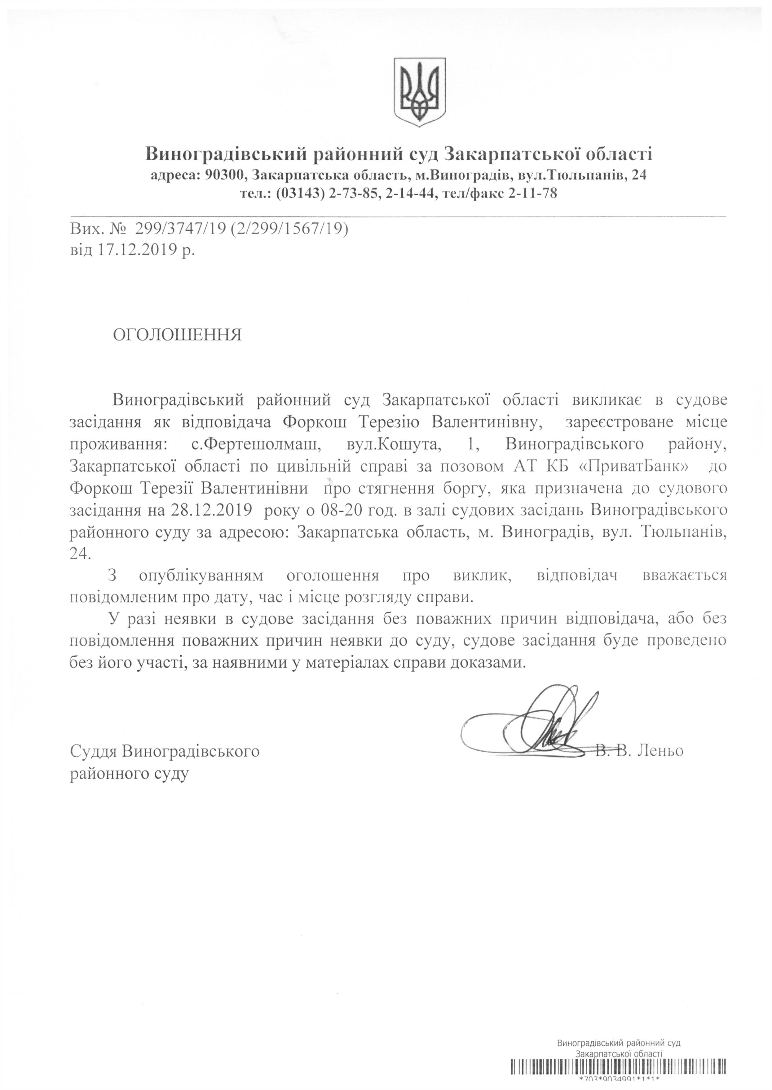 Оголошення про виклик в судове засідання Форкош Т.В.