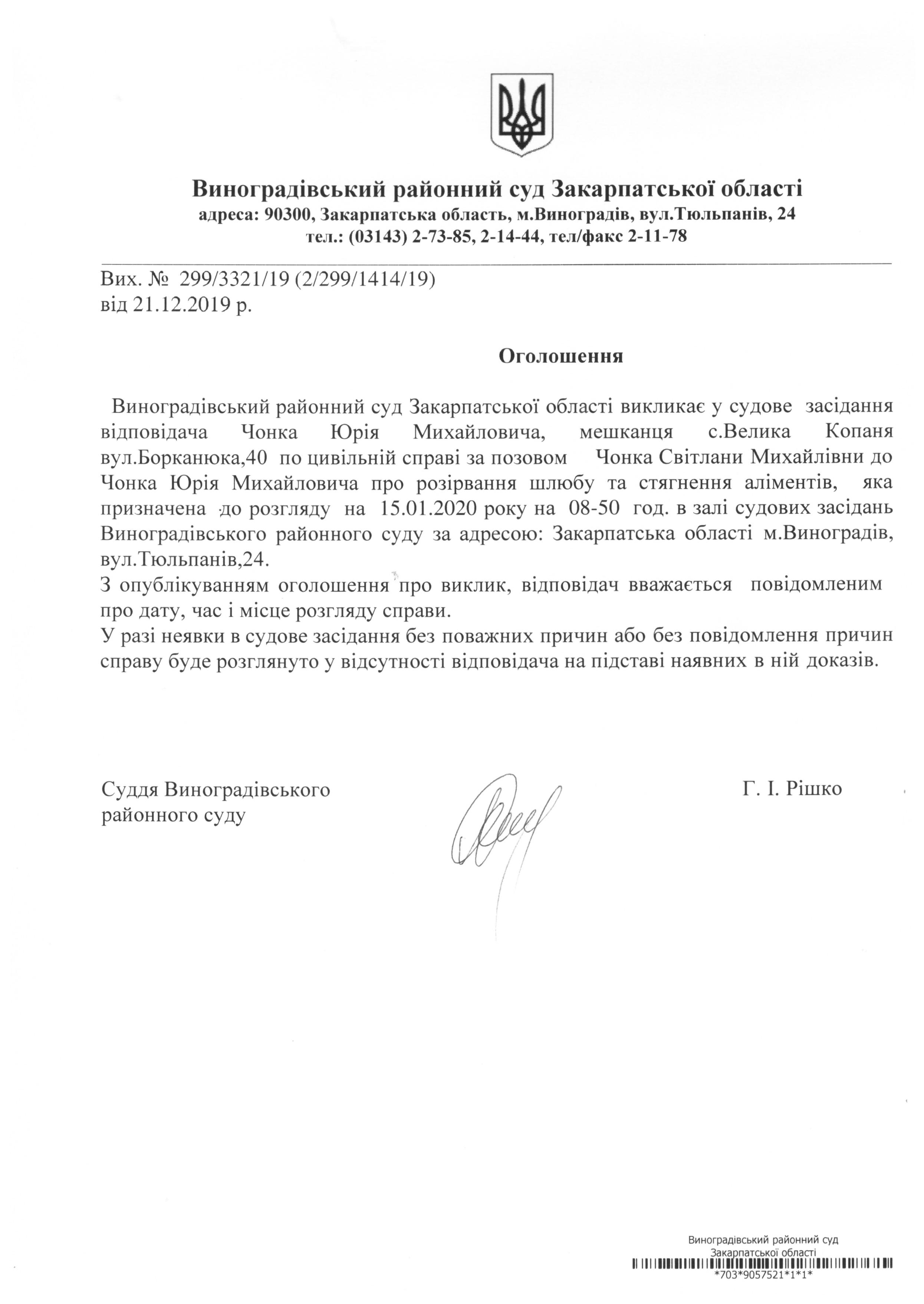 Оголошення про виклик в судове засідання Чонка Ю.М.