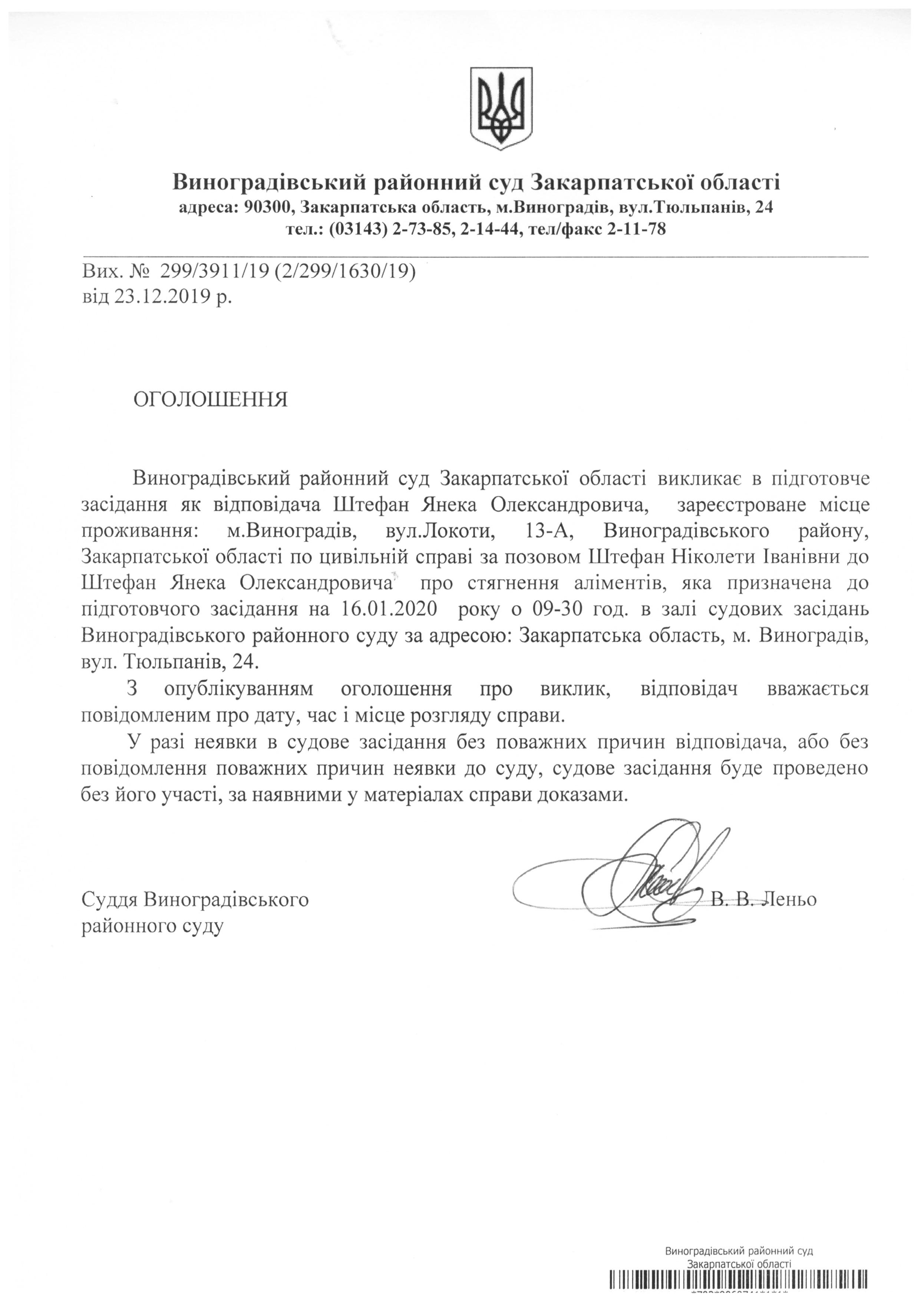 Оголошення про виклик в судове засідання Штефан Я.О.