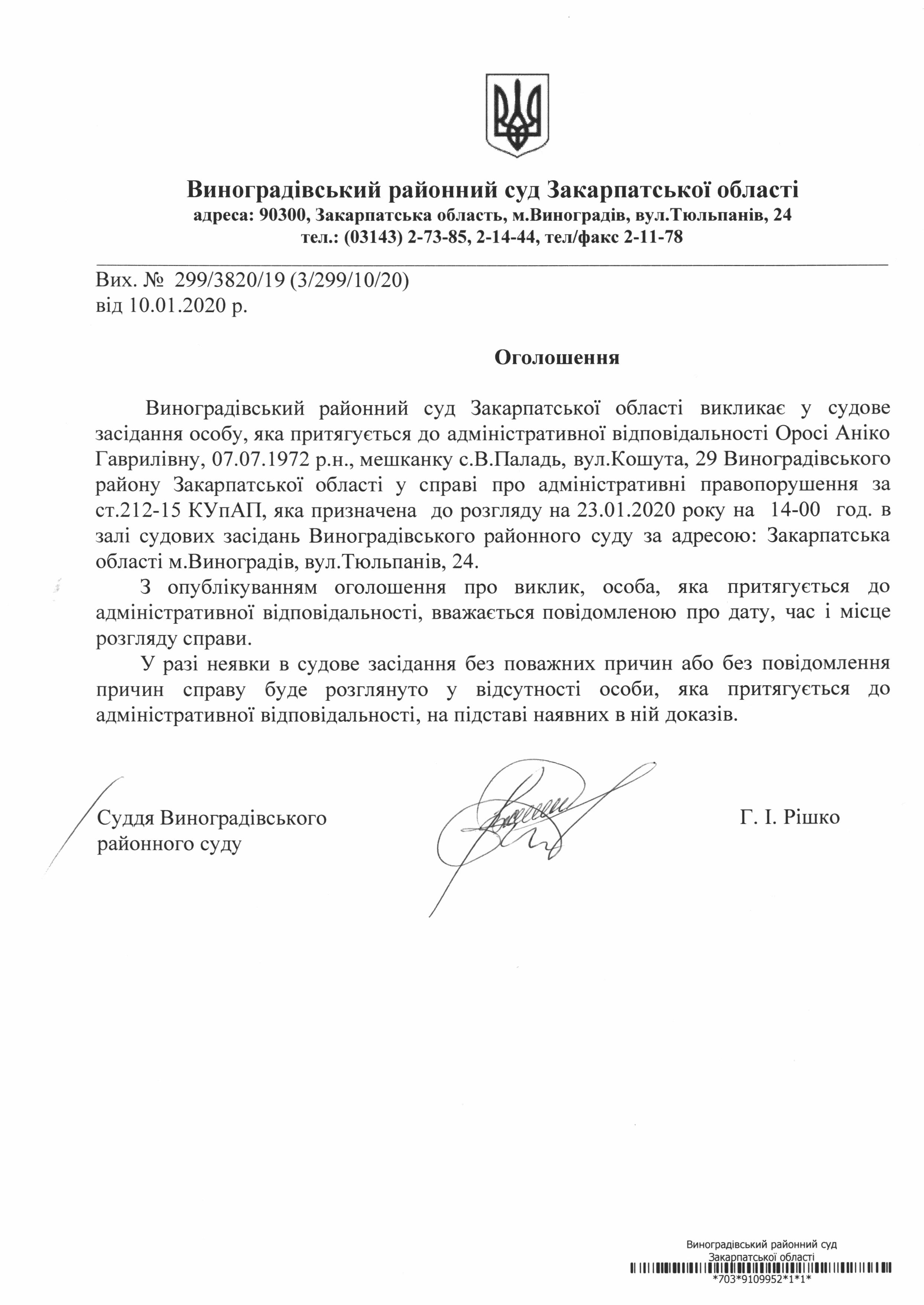Оголошення про виклик в судове засідання Оросі А.Г.