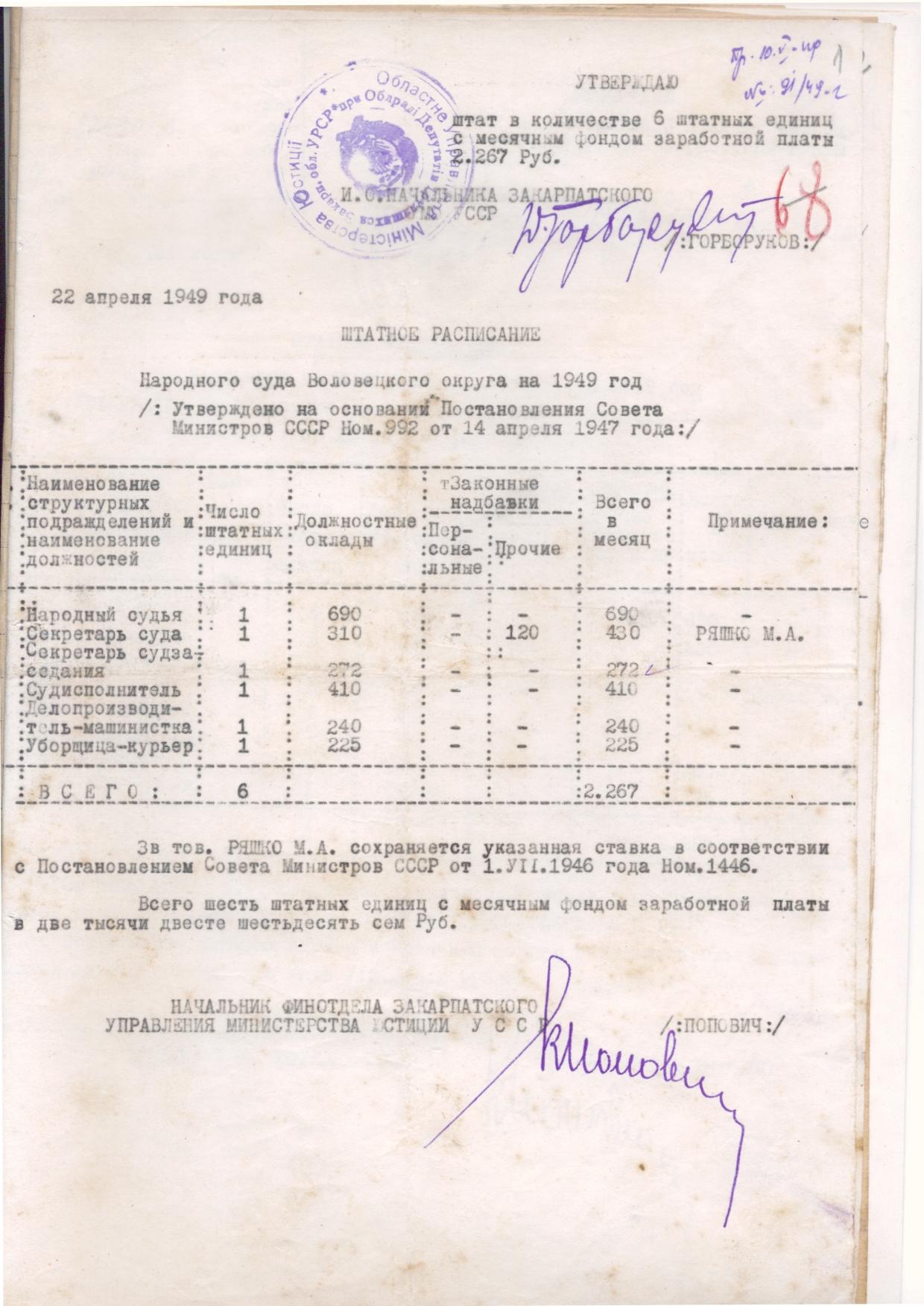 Штатний розпис народного суду Воловецького округу на 1949 рік