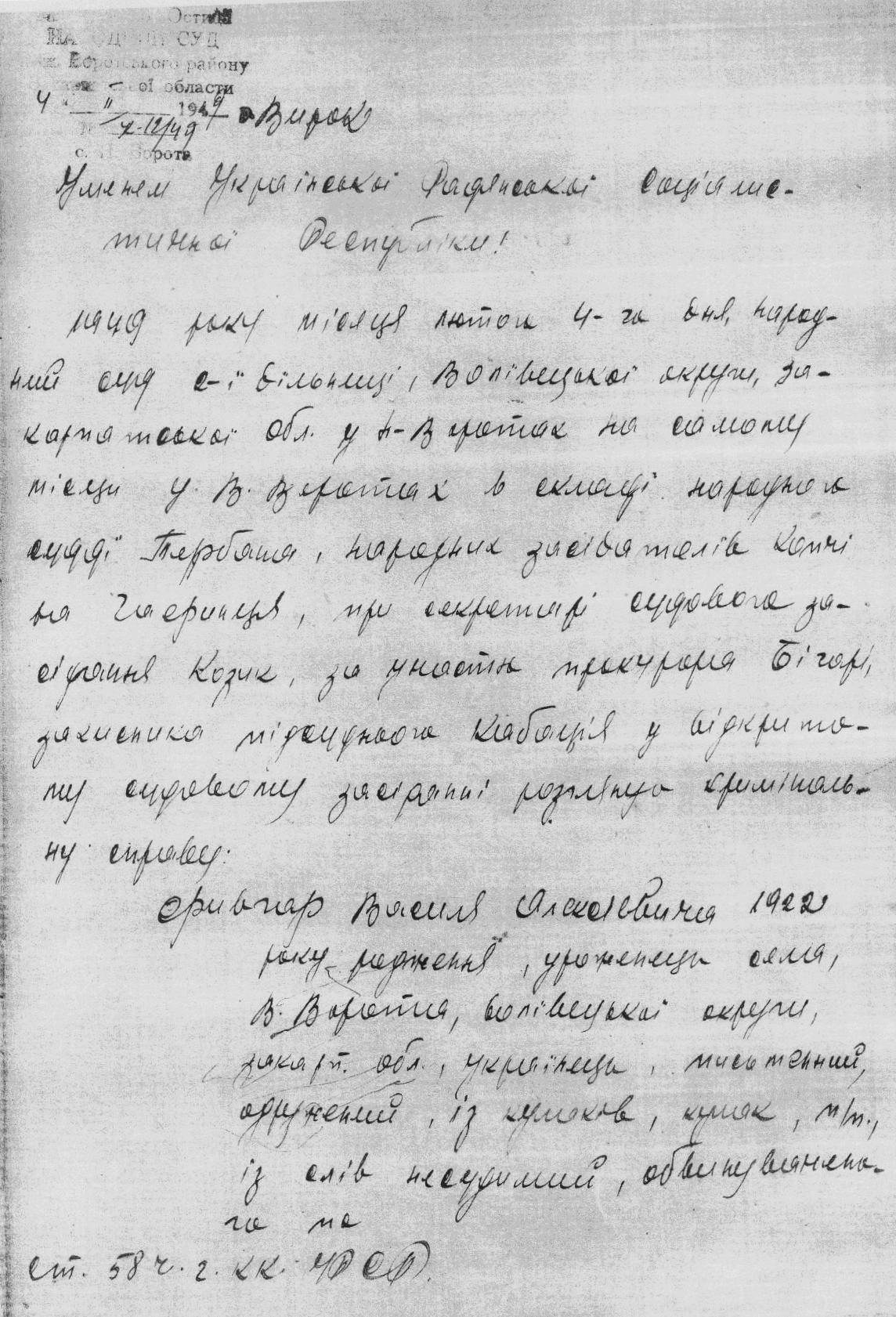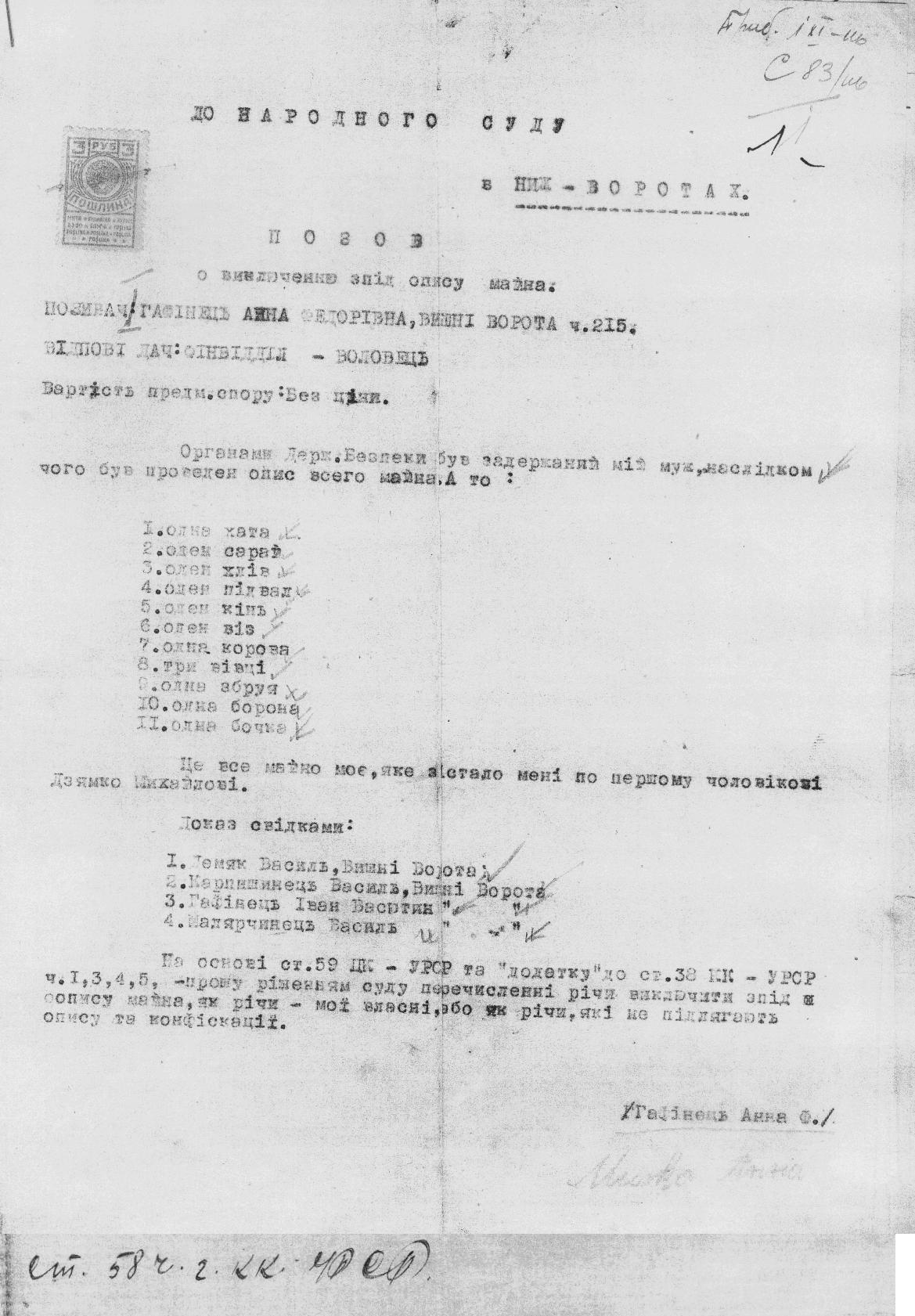 Истица подала у нар.суда в Ниж. Воротах иск, в котором просит, чтоб описанное имуществапод чис.3-29/46 дня 9.Х!!.1946 года которое было конфисковано Военным Требуналом из под описи исключено так как конфискованное имущество состоится собственностью а не собственностью ея засужденного мужа за которого вышла за муж второй раз и жила с нем 6.лет. Описанное имущество одна хата, один сарай, один хлев, один подвал, один конь, одна корова, один воз, 3.овцы, одна упряж, одна борона, одна бочка и 2-е месячных поросят приобрела все имущество из своим первым мужом а малыя поросята покупила себе после ухода мужа.