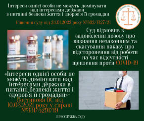 -«інтереси однієї особи не можуть домінувати над інтересами держави в питанні безпеки життя і здоров`я її громадян» (Постанова Верховного Суду від 10.03.2021 року у справі №331/5291/19);