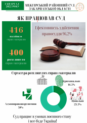 Упродовж трьох місяців поточного року на розгляд до Міжгірського райсуду надійшло 416 справ і матеріалів, що більше на 19,9%, ніж за аналогічний період 2021 року. Варто зазначити, що 326 з них надійшли ще до початку збройної агресії росії проти України.