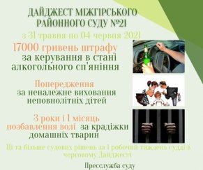 З 31 травня по 04 червня 2021 року судом прийнято 50 остаточних рішень, короткий огляд яких наведено нижче. З повними їх текстами можна ознайомитись в Єдиному державному реєстрі судових рішень за номером і датою.