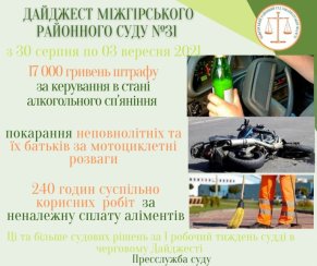 З 30 серпня по 03 вересня 2021 року судом прийнято 40 остаточних рішень, короткий огляд яких наведено нижче. З повними їх текстами можна ознайомитись в Єдиному державному реєстрі судових рішень за номером і датою.