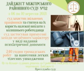 З 06 по 10 вересня 2021 року судом прийнято 56 остаточних рішень, короткий огляд яких наведено нижче. З повними їх текстами можна ознайомитись в Єдиному державному реєстрі судових рішень за номером і датою.