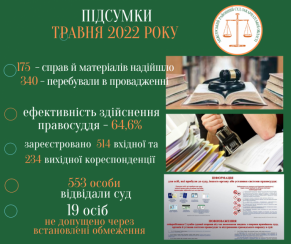 В травні 2022 року ухвалено і надіслано до Єдиного державного реєстру судових рішень 233 рішення суду.