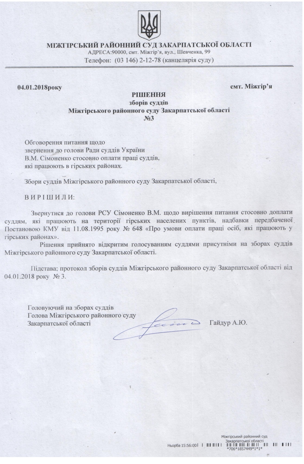 Рішення зборів суддів Міжгірського районного суду Закарпатської області № 3 Обговорення питання щодо звернення до голови Ради суддів України В.М. Сімоненко стосовно оплати праці суддів, які працюють в гірських районах. Збори суддів Міжгірського районного суду Закарпатської області