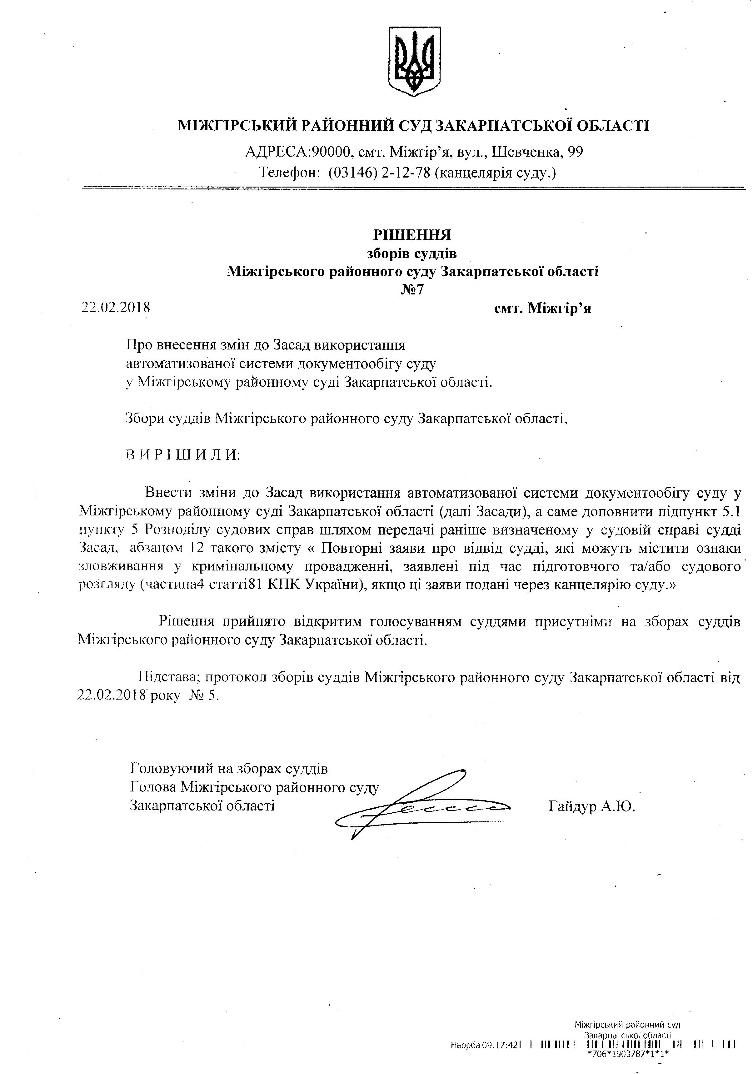 Рішення зборів суддів Міжгірського районного суду Закарпатської області № 7Про внесення змін до Засад використання автоматизованої системи документообігу суду у Міжгірському районному суді Закарпатської області. Збори суддів Міжгірського районного суду Закарпатської області