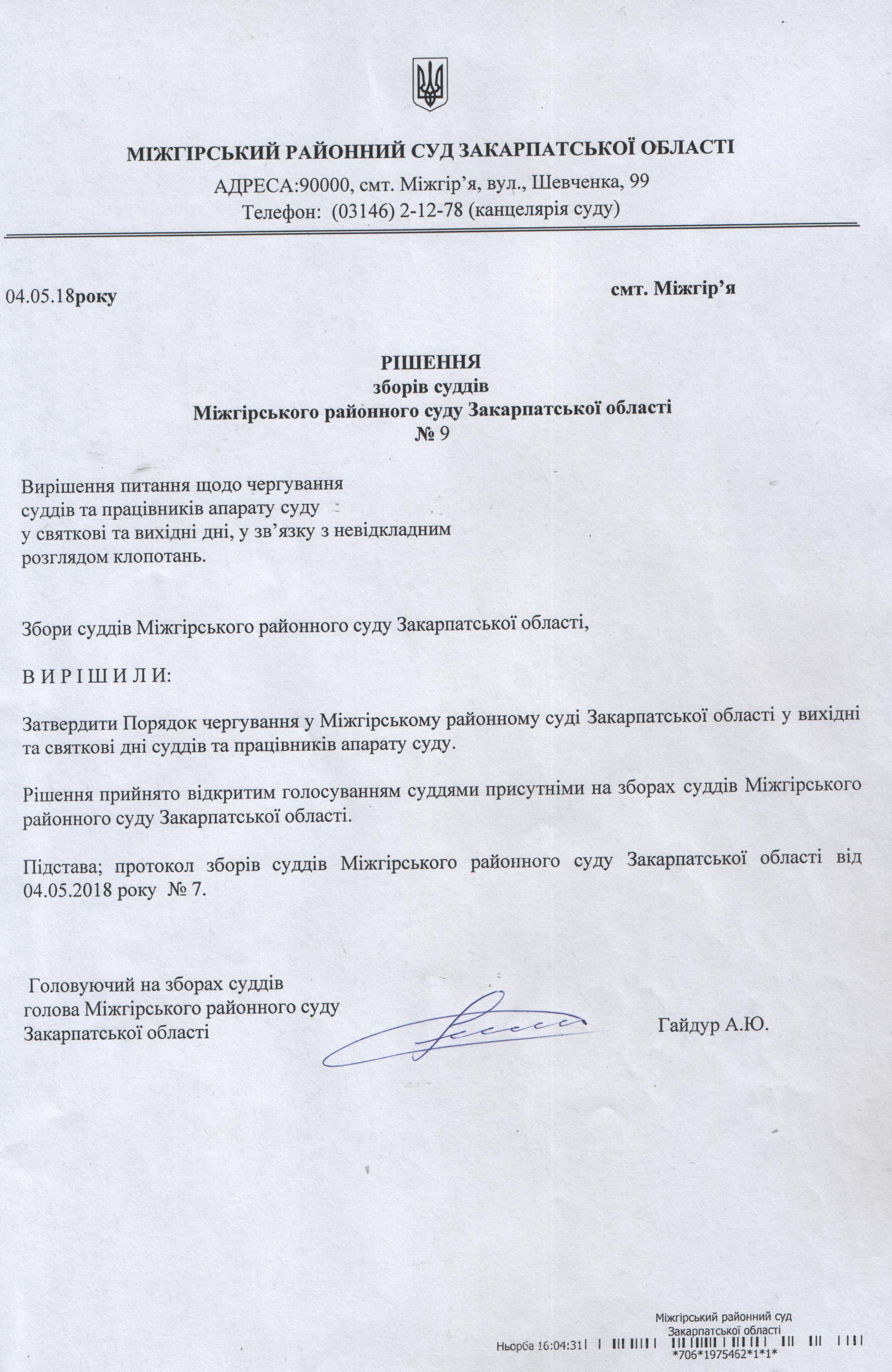 Рішення зборів суддів Міжгірського районного суду Закарпатської області № 9 Вирішення питання щодо чергування суддів та працівників апарату суду у святкові та вихідні дні, у зв’язку з невідкладним розглядом клопотань.