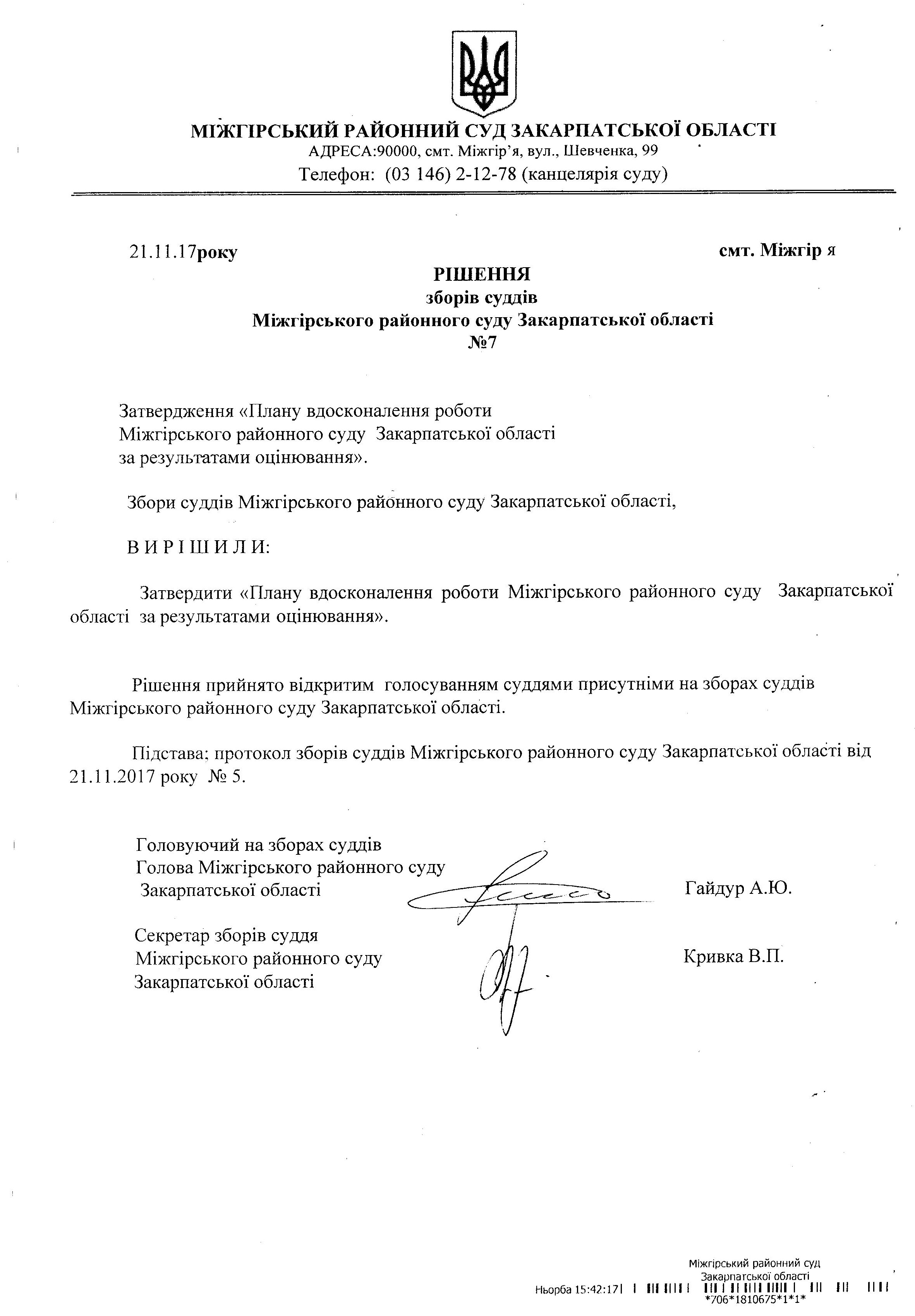 Рішення зборів суддів Міжгірського районного суду Закарпатської області № 7 "Щодо затвердження Плану вдосконалення роботи Міжгірського районного суду Закарпатської області за результатами оцінювання
