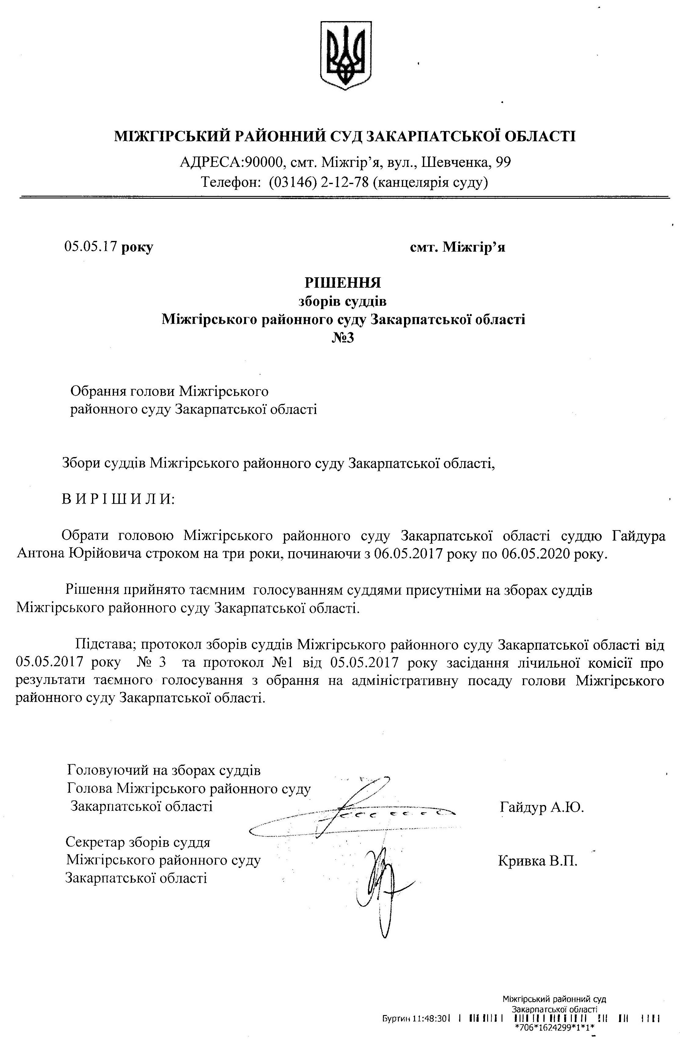 Рішення зборів суддів Міжгірського районного суду Закарпатської області № 3" Про обрання голови суду"