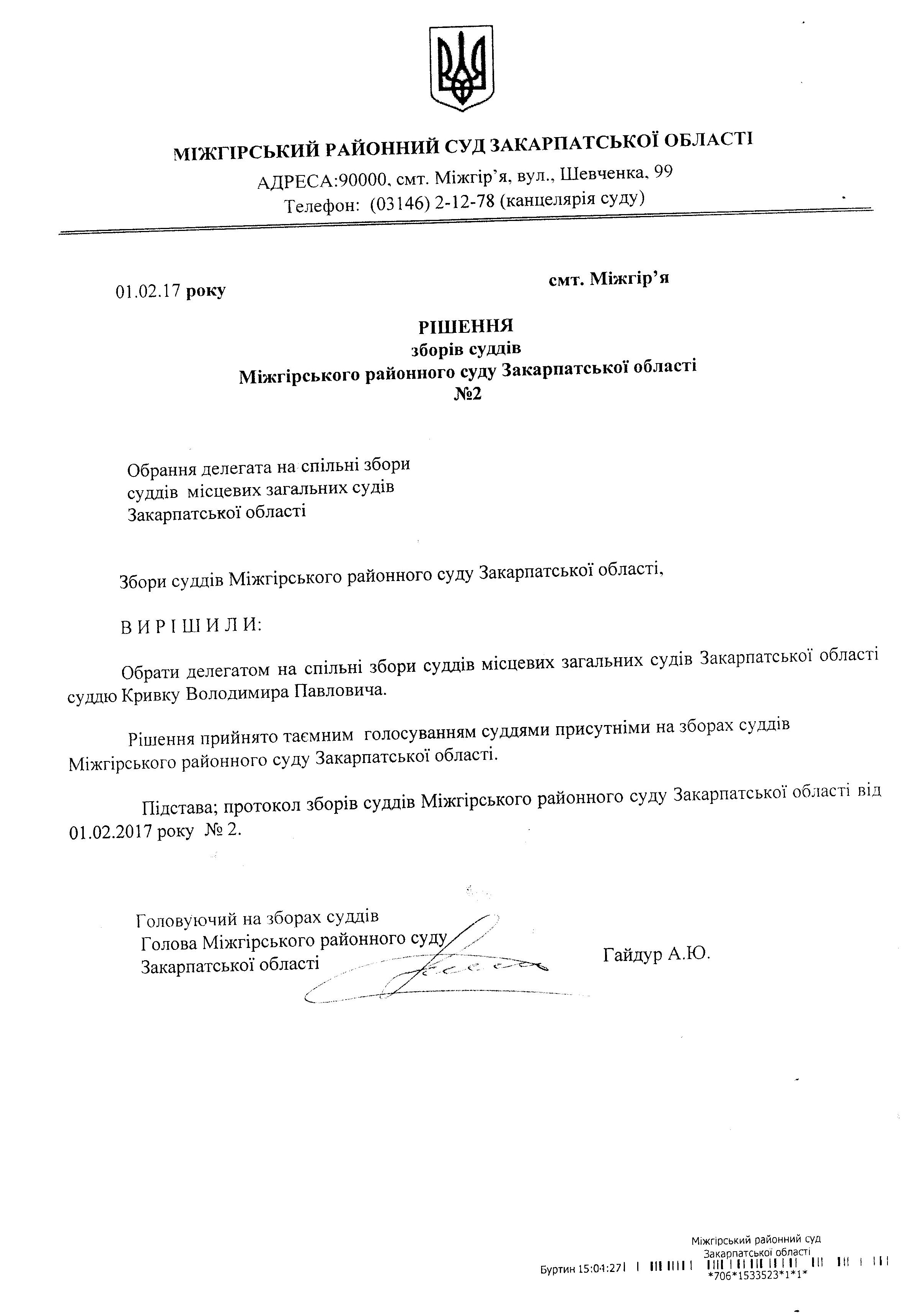 Рішення зборів суддів Міжгірського районного суду Закарпатської області № 2" Щодо обрання делегатів на спільні збори суддів місцевих загальних судів Закарпатської області"