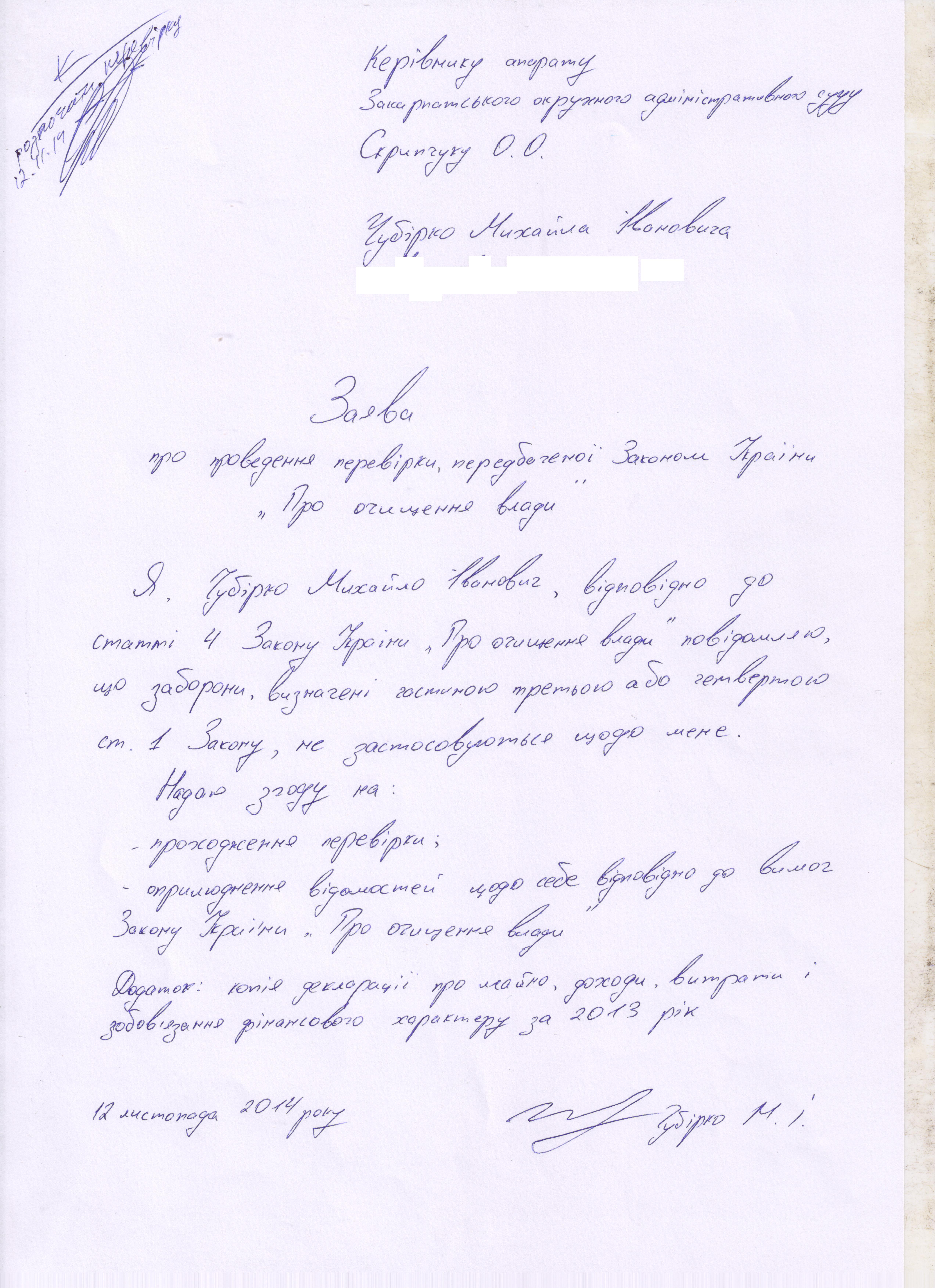 Повідомляємо, що у Закарпатському окружному адміністративному суді розпочато перевірку, передбачену Законом України “Про очищення влади”, щодо Чубірко Михайла Івановича, секретаря судового засідання Закарпатського окружного адміністративного суду (копії заяви і декларації про майно, доходи, витрати і зобов’язання фінансового характеру за 2013 р. додаються).