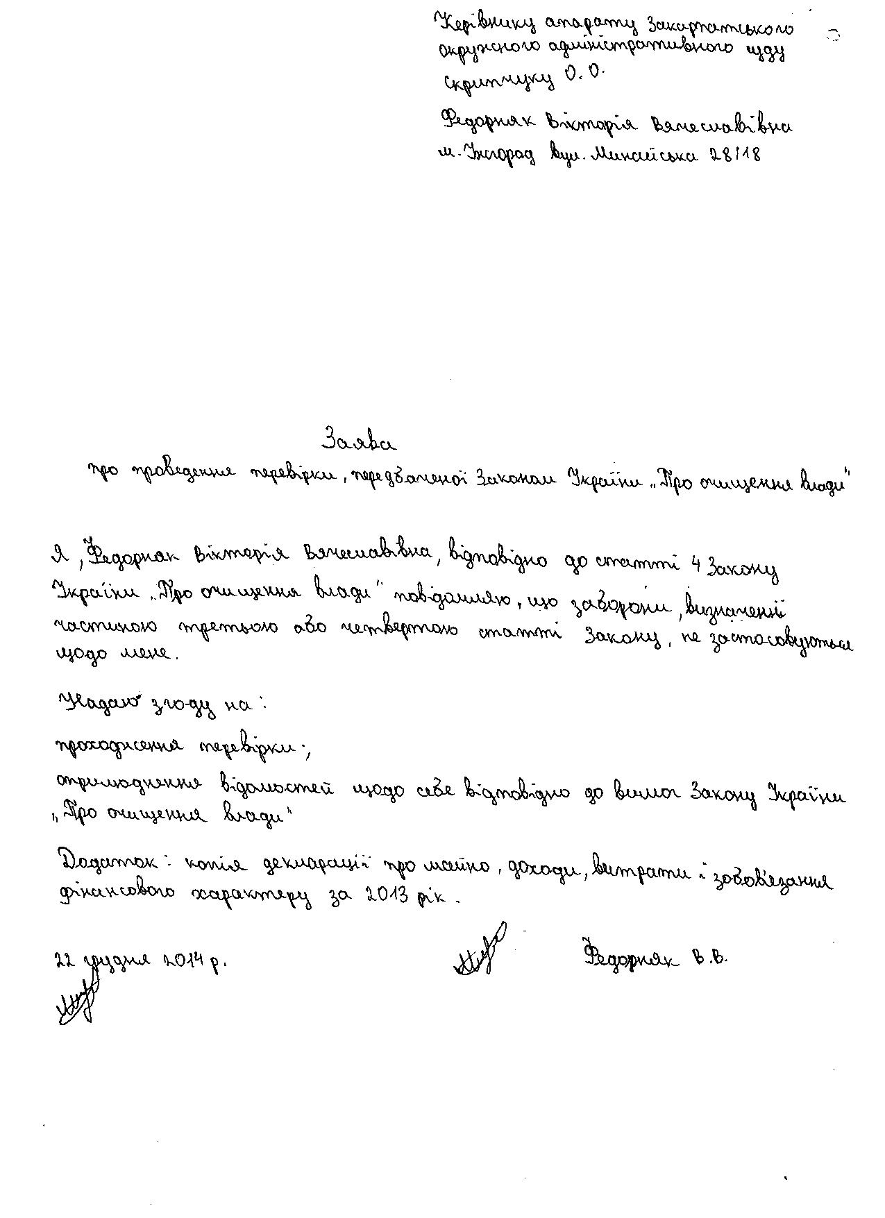Повідомляємо, що у Закарпатському окружному адміністративному суді розпочато перевірку, передбачену Законом України “Про очищення влади”, щодо Федорняк Вікторії Вячеславівни, діловода Закарпатського окружного адміністративного суду (копії заяви і декларації про майно, доходи, витрати і зобов’язання фінансового характеру за 2013 р. додаються).