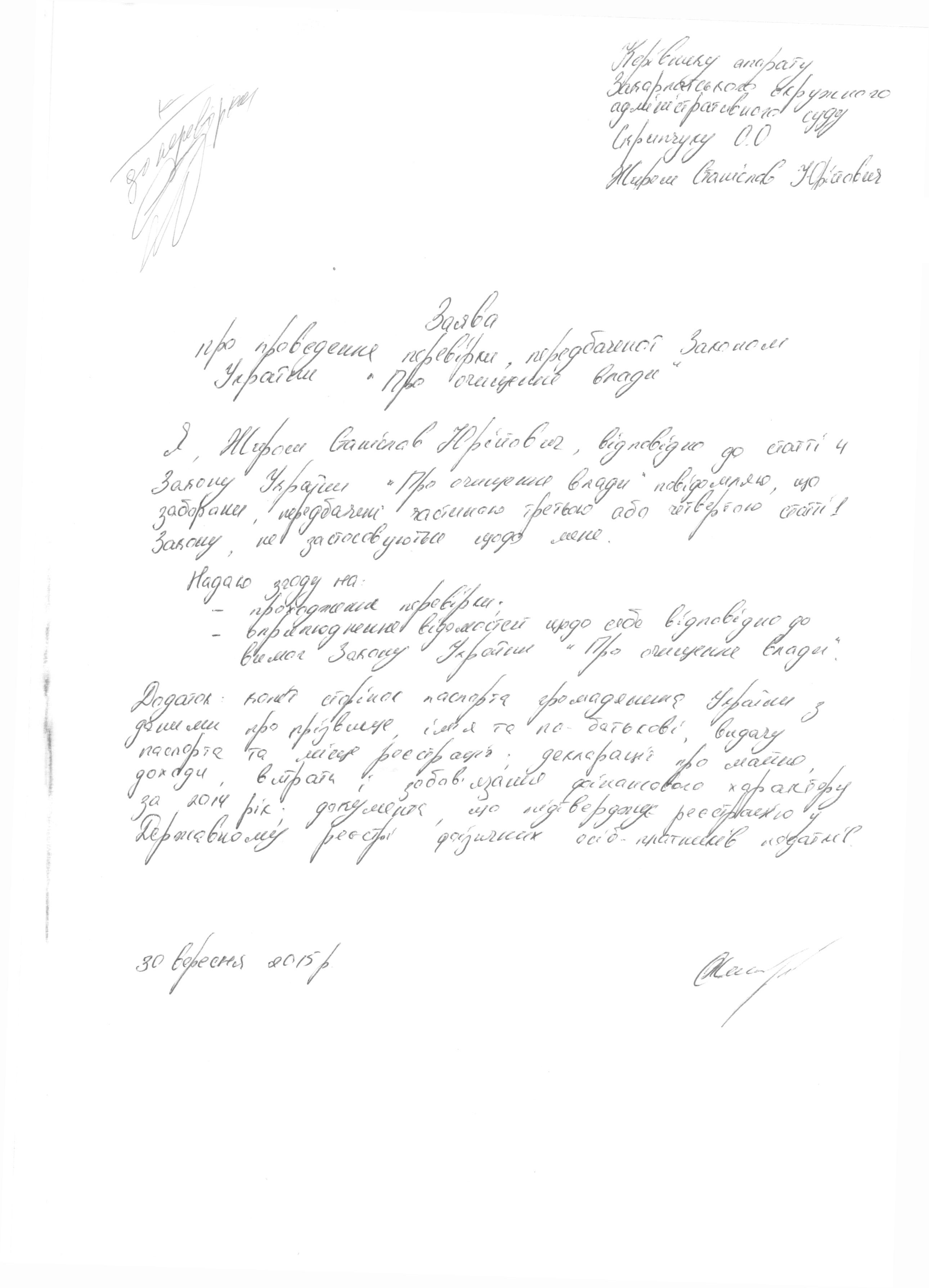 Повідомляємо, що у Закарпатському окружному адміністративному суді розпочато перевірку, передбачену Законом України “Про очищення влади”, щодо Жирош Станіслав Юрійович, судовий розпорядник Закарпатського окружного адміністративного суду (копії заяви і декларації про майно, доходи, витрати і зобов’язання фінансового характеру за 2014 р. додаються).