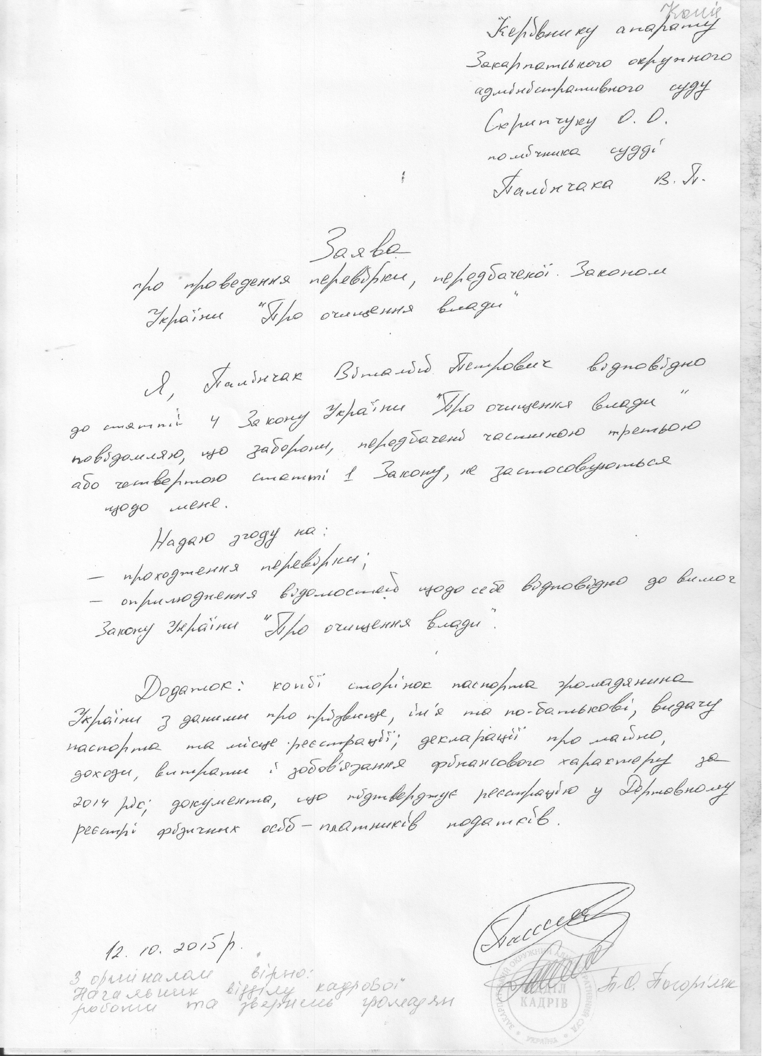 Повідомляємо, що у Закарпатському окружному адміністративному суді розпочато перевірку, передбачену Законом України “Про очищення влади”, щодо Палінчак Віталій Петрович, помічника судді Закарпатського окружного адміністративного суду (копії заяви і декларації про майно, доходи, витрати і зобов’язання фінансового характеру за 2014 р. додаються).