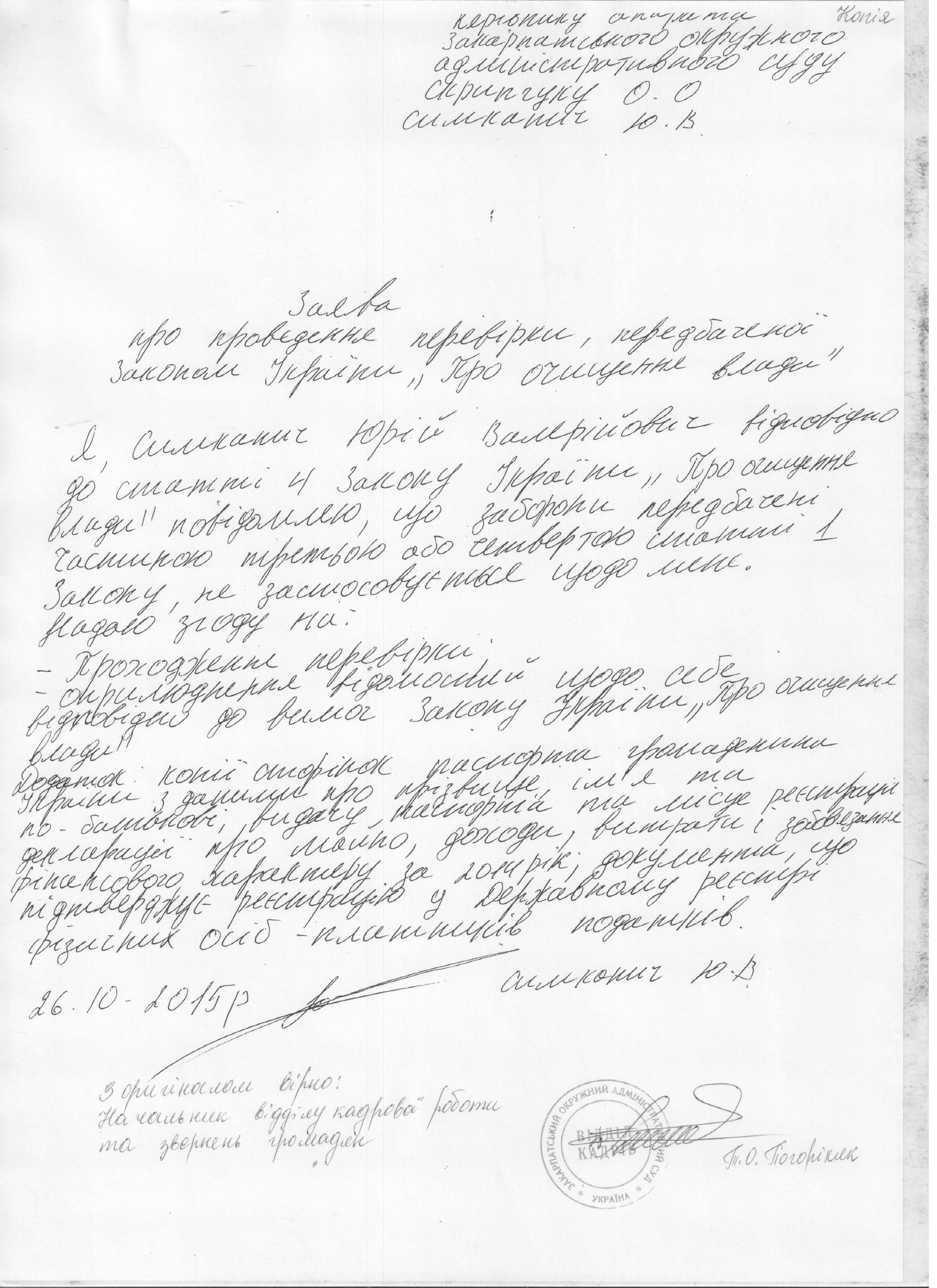 Повідомляємо, що у Закарпатському окружному адміністративному суді розпочато перевірку, передбачену Законом України “Про очищення влади”, щодо Симканича Юрія Валерійовича, секретаря судових засідань Закарпатського окружного адміністративного суду (копії заяви і декларації про майно, доходи, витрати і зобов’язання фінансового характеру за 2014 р. додаються).