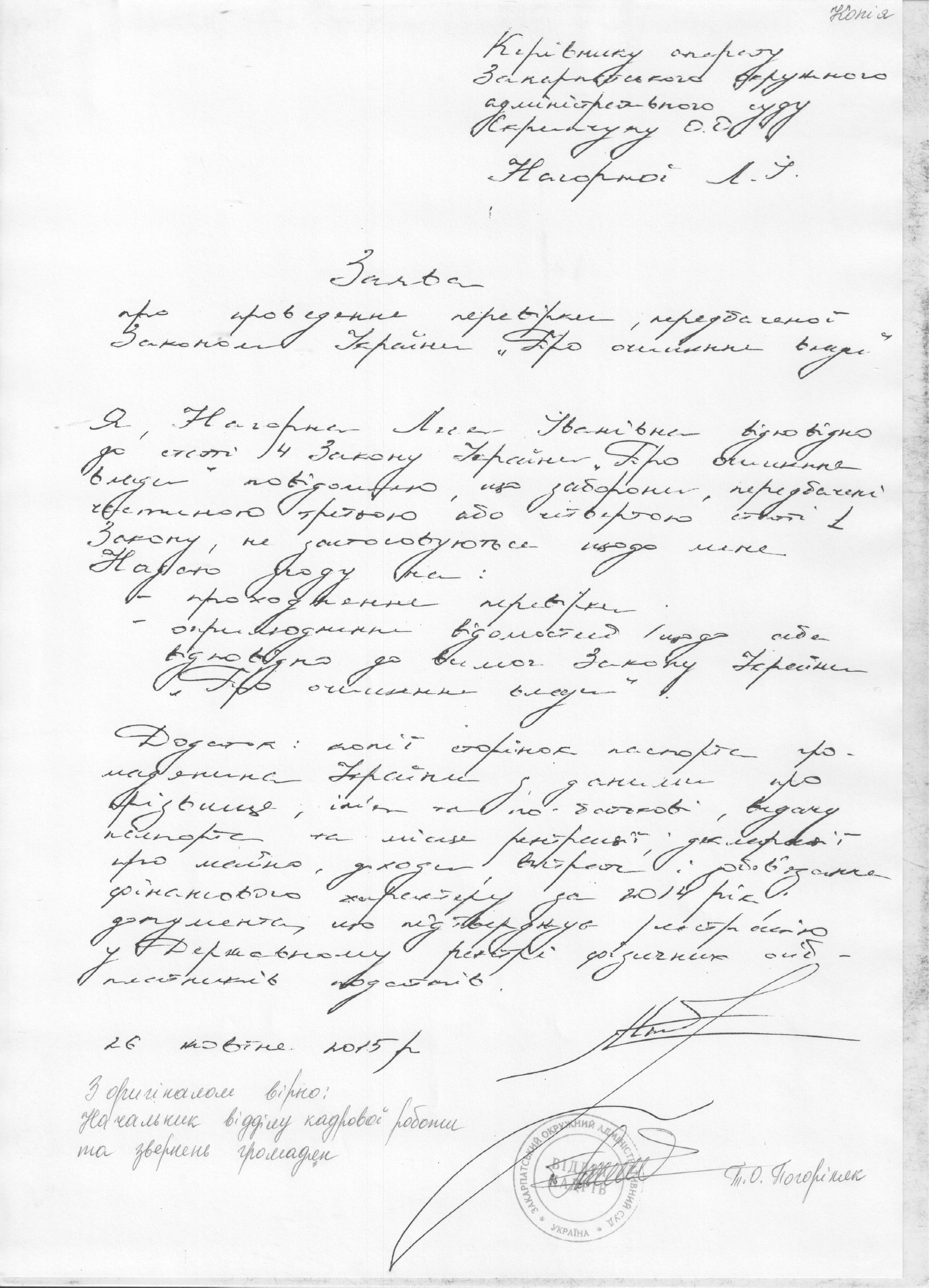 Повідомляємо, що у Закарпатському окружному адміністративному суді розпочато перевірку, передбачену Законом України “Про очищення влади”, щодо Нагорної Лесі Іванівни, секретаря судових засідань Закарпатського окружного адміністративного суду (копії заяви і декларації про майно, доходи, витрати і зобов’язання фінансового характеру за 2014 р. додаються).