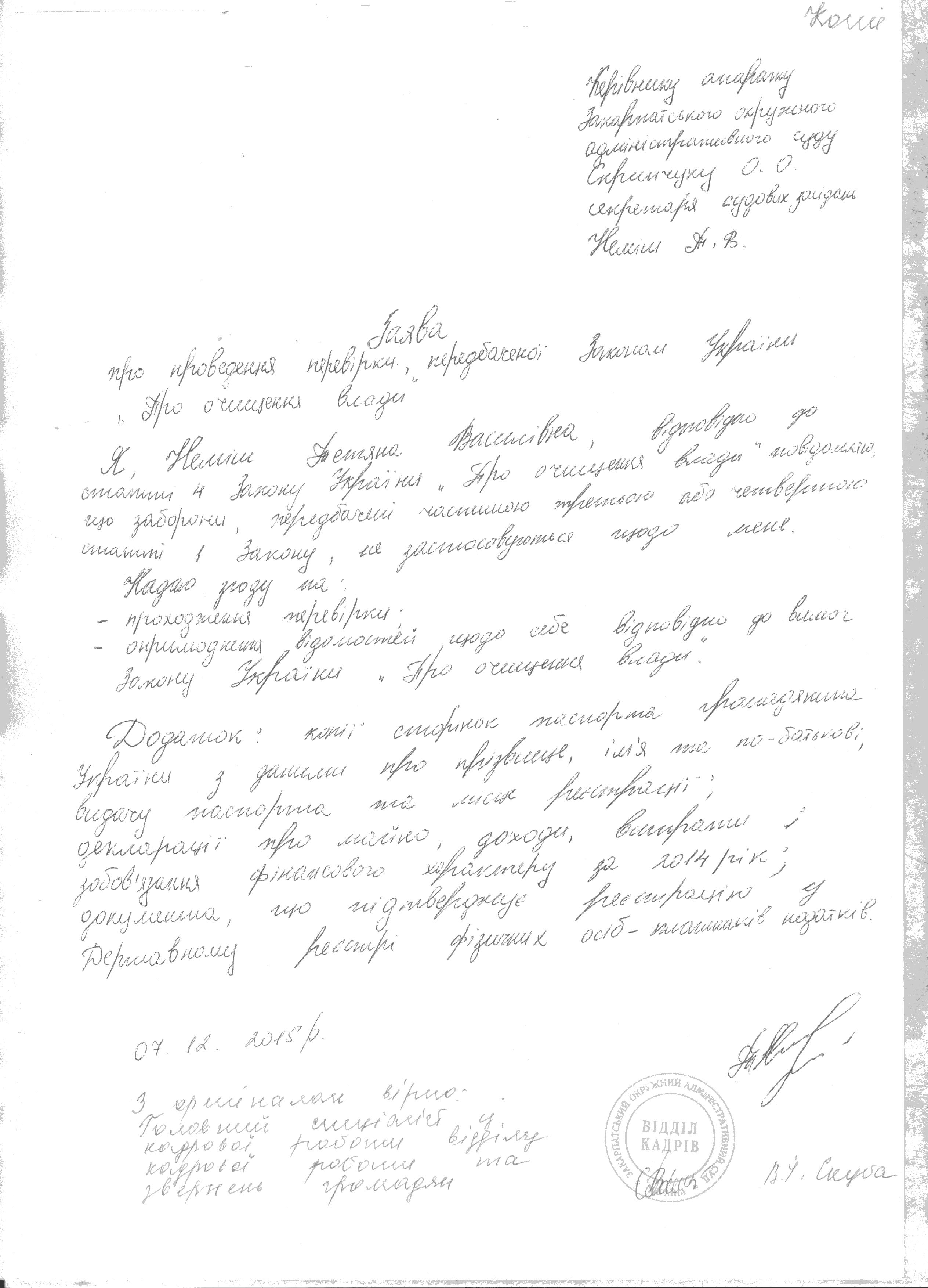 Повідомляємо, що у Закарпатському окружному адміністративному суді розпочато перевірку, передбачену Законом України “Про очищення влади”, щодо Неміш Тетяни Василівни, секретаря судових засідань Закарпатського окружного адміністративного суду (копії заяви і декларації про майно, доходи, витрати і зобов’язання фінансового характеру за 2014 р. додаються).