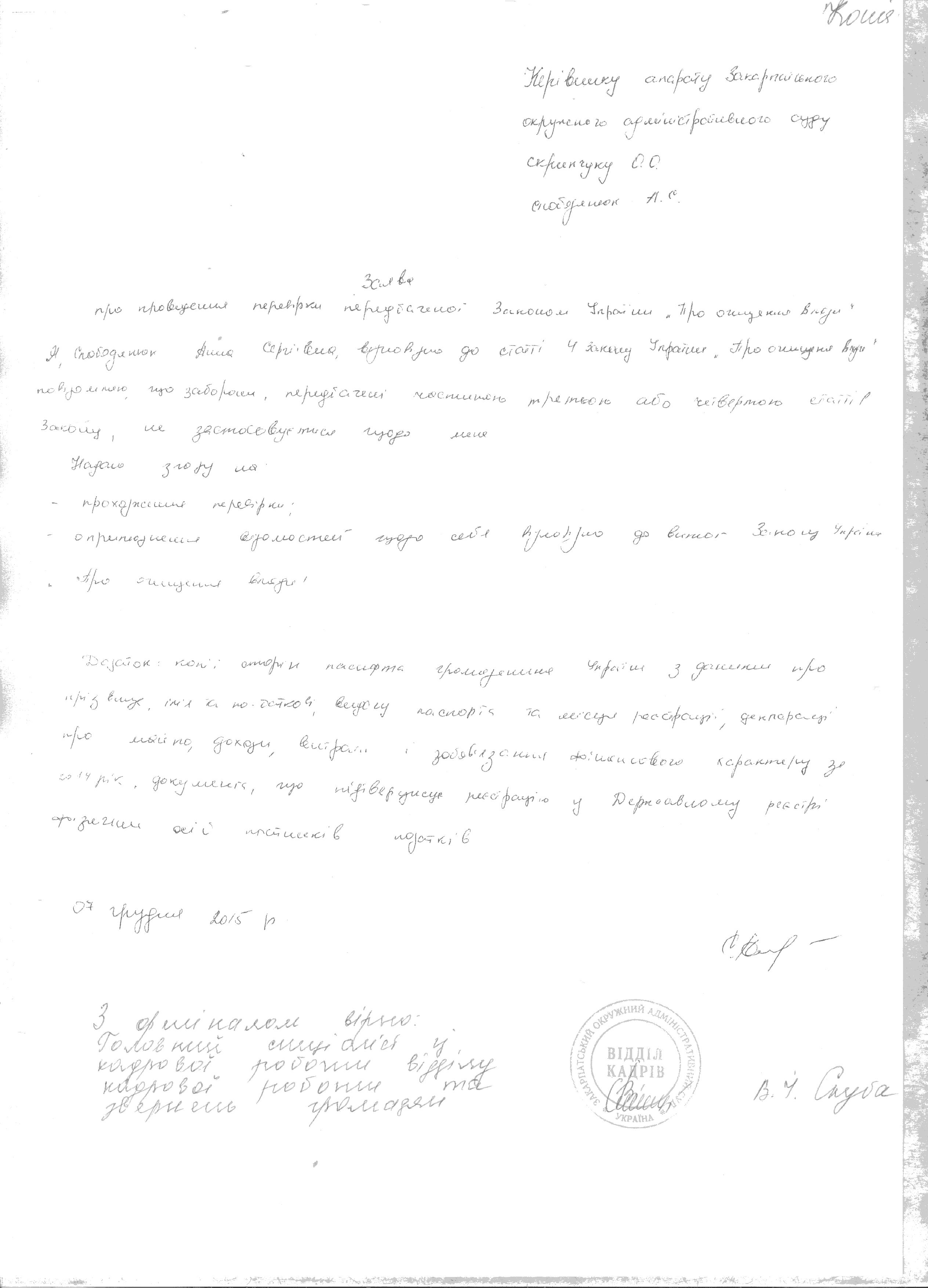 Повідомляємо, що у Закарпатському окружному адміністративному суді розпочато перевірку, передбачену Законом України “Про очищення влади”, щодо Слободанюк Анни Сергіївни, помічника заступника голови Закарпатського окружного адміністративного суду (копії заяви і декларації про майно, доходи, витрати і зобов’язання фінансового характеру за 2014 р. додаються).