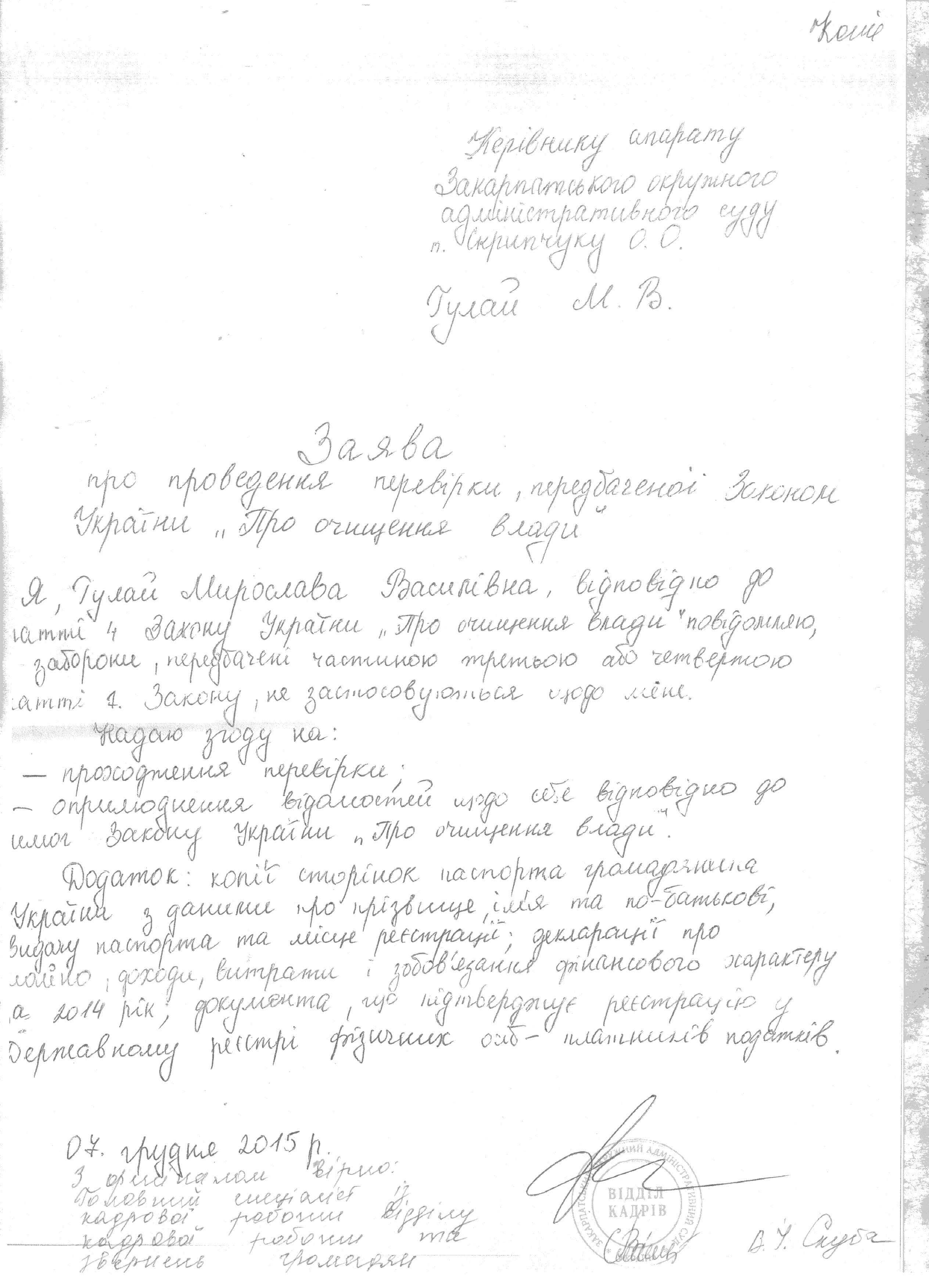 Повідомляємо, що у Закарпатському окружному адміністративному суді розпочато перевірку, передбачену Законом України “Про очищення влади”, щодо Гулай Мирослави Василівни, секретаря судових засідань Закарпатського окружного адміністративного суду (копії заяви і декларації про майно, доходи, витрати і зобов’язання фінансового характеру за 2014 р. додаються).