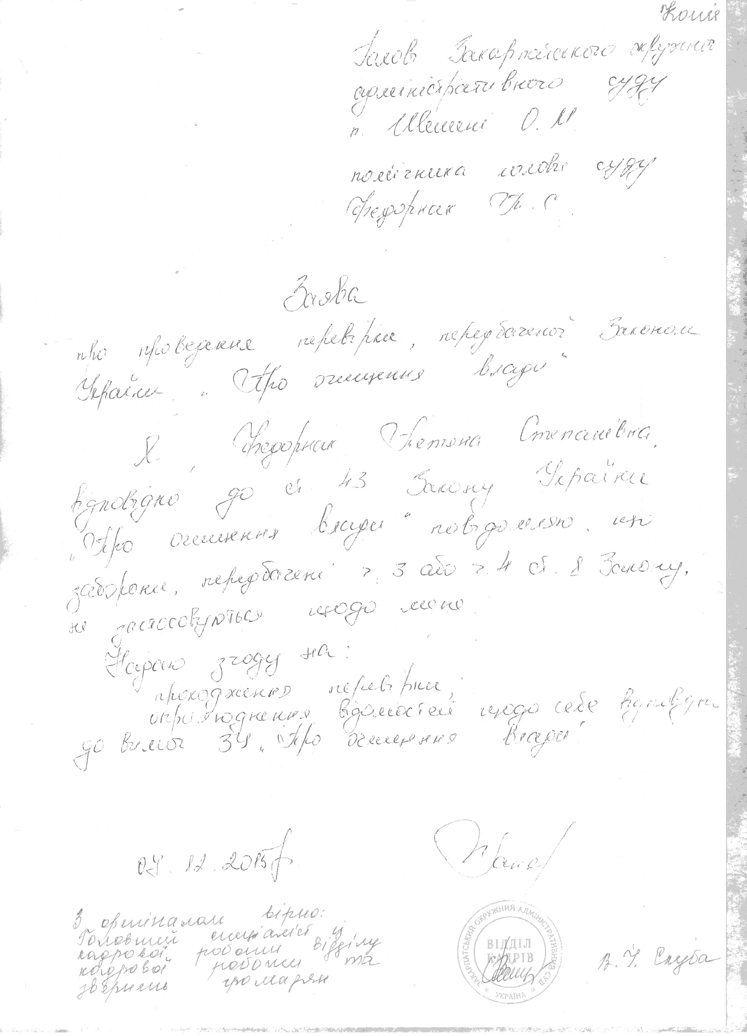 Повідомляємо, що у Закарпатському окружному адміністративному суді розпочато перевірку, передбачену Законом України “Про очищення влади”, щодо Федорнак Тетяни Степанівни, помічника голови Закарпатського окружного адміністративного суду (копії заяви і декларації про майно, доходи, витрати і зобов’язання фінансового характеру за 2014 р. додаються).