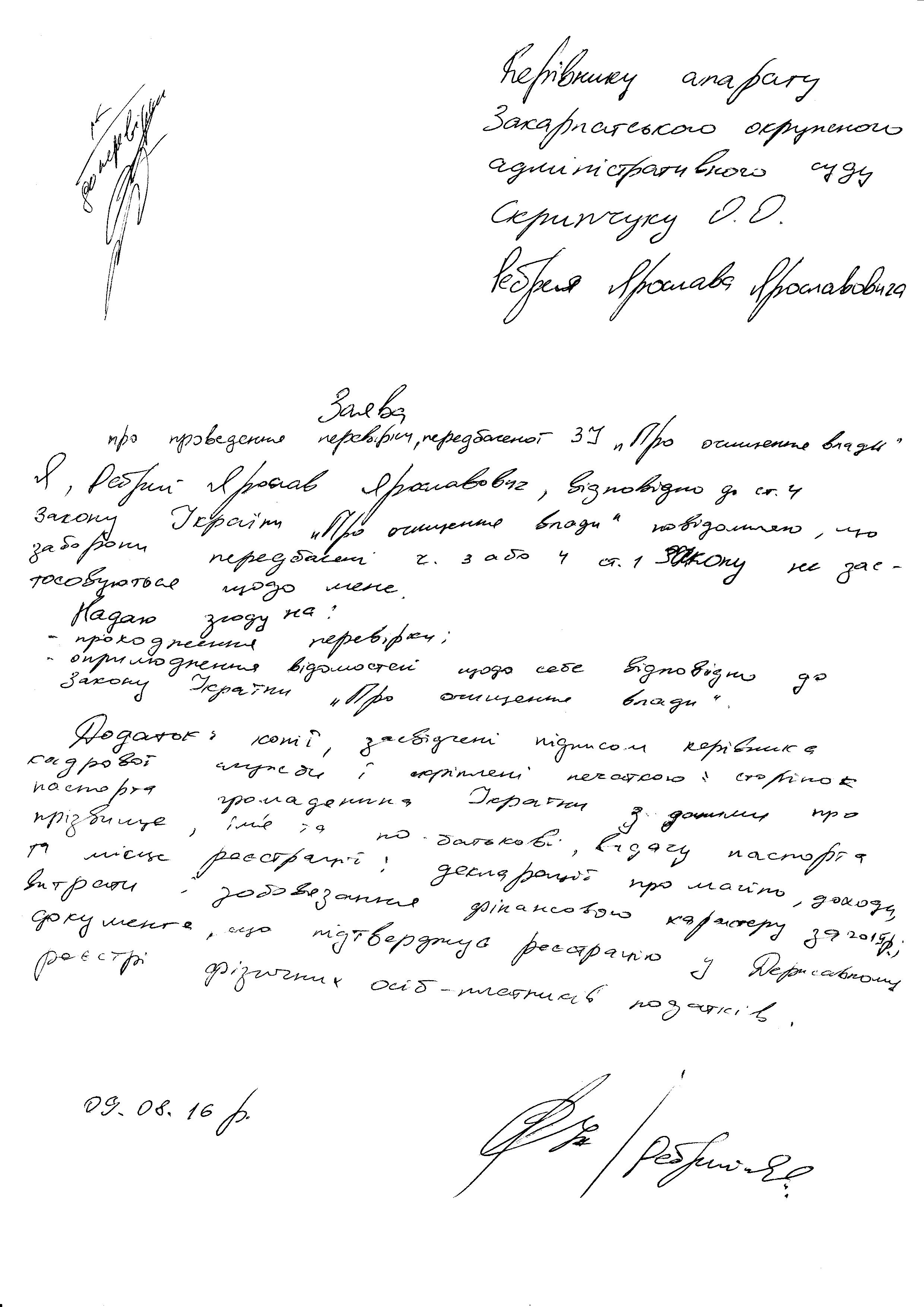 Повідомляємо, що у Закарпатському окружному адміністративному суді розпочато перевірку, передбачену Законом України “Про очищення влади”, щодо Ребрей Ярослав Ярославович, помічника судді Закарпатського окружного адміністративного суду (копії заяви і декларації про майно, доходи, витрати і зобов’язання фінансового характеру за 2015 р. додаються).