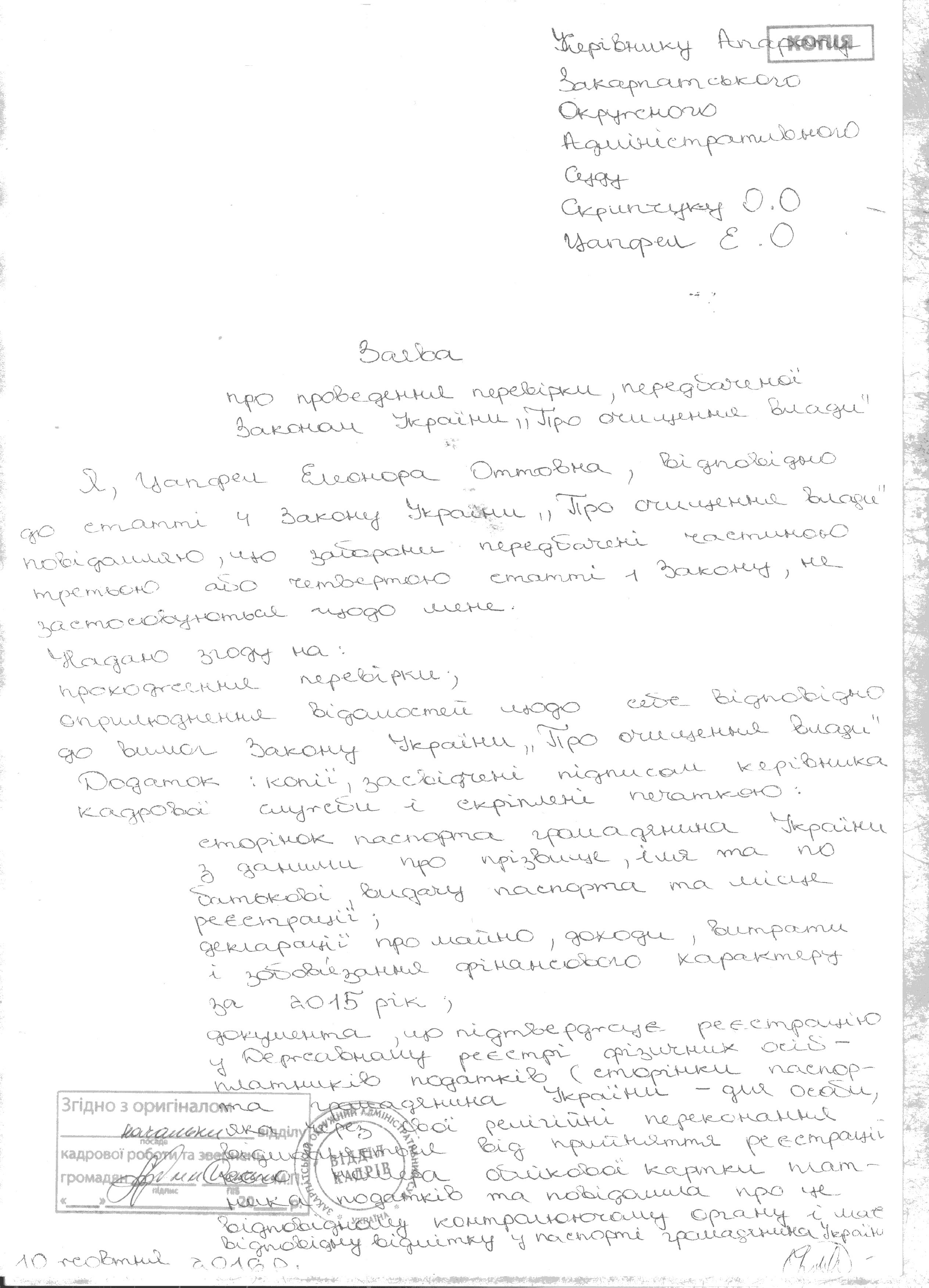 Повідомляємо, що у Закарпатському окружному адміністративному суді розпочато перевірку, передбачену Законом України “Про очищення влади”, щодо Цапфел Елеонора Оттовна, секретаря судового засідання Закарпатського окружного адміністративного суду (копії заяви і декларації про майно, доходи, витрати і зобов’язання фінансового характеру за 2015 р. додаються).