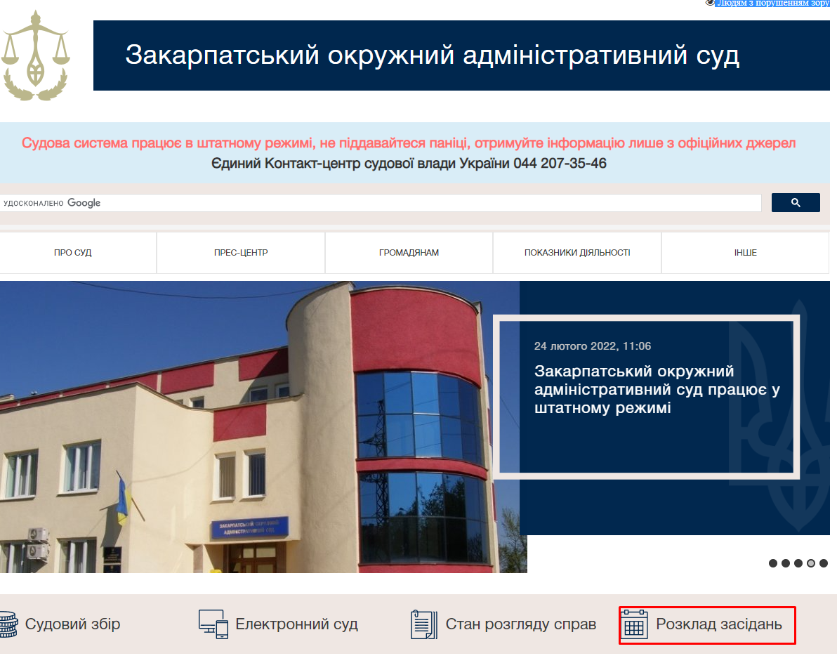 Одночасно повідомляємо, що на сайті Закарпатського окружного адміністративного суду у розділі Розклад засідань можна ознайомитися із списком справ, призначених до розгляду.
