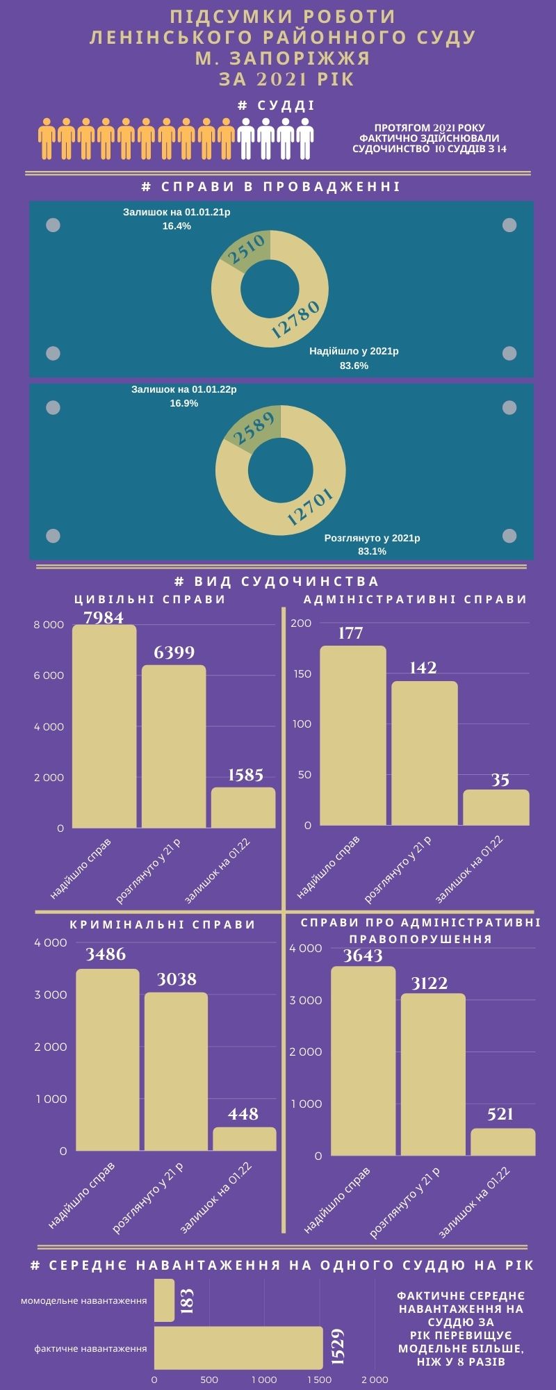 Впродовж 2021 року в суді фактично здійснювали правосуддя 10 суддів з 14, посади яких передбачено штатним розкладом. А отже, з урахуванням кількості надходжень до суду справ та матеріалів, середнє модельне навантаження на одного суддю Ленінського районного суду м. Запоріжжя у 2021 році перевищувало більше ніж у 8 разів.