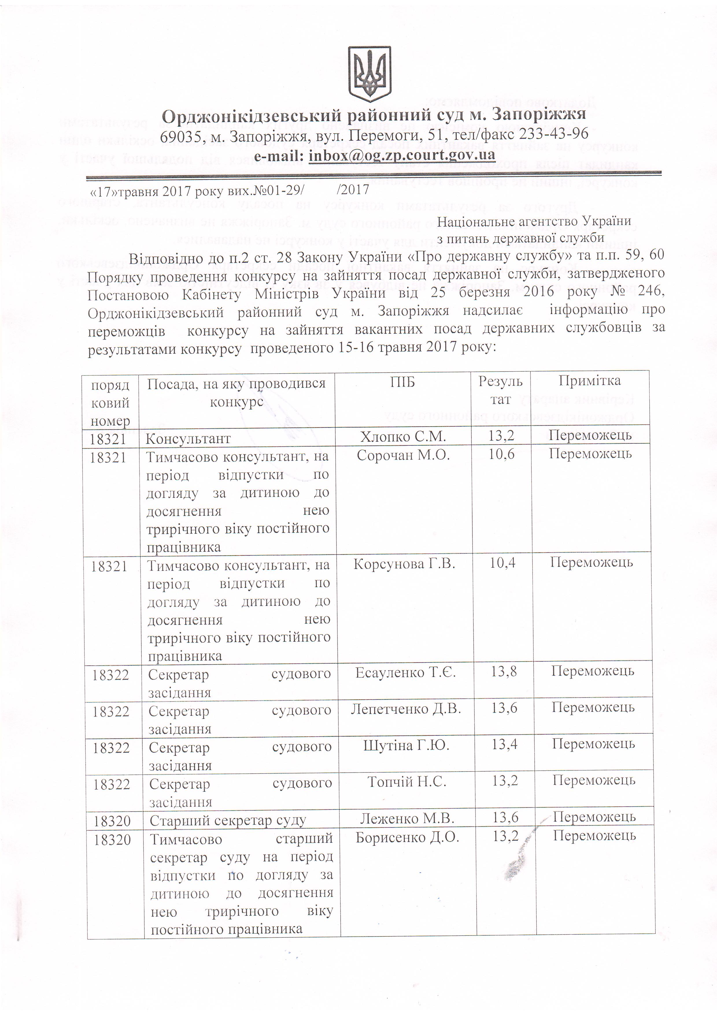 Результати конкурсу на зайняття вакантних посад державних службовців, проведенного 15-16 травня 2017 року