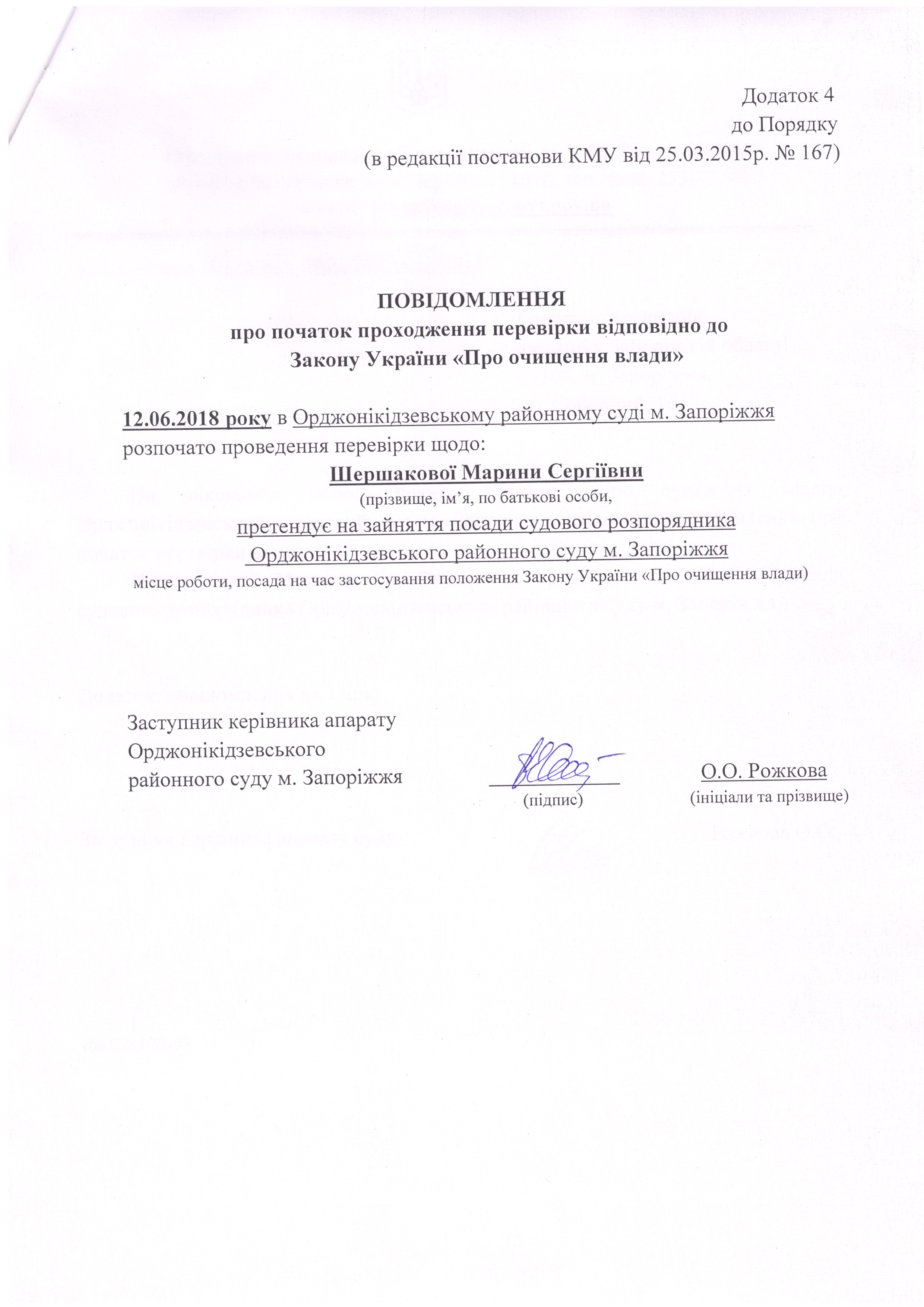 ПОВІДОМЛЕННЯ про початок перевірки відповідно до ЗУ "Про очищення влади" - Шершакова Марина Сергіївна