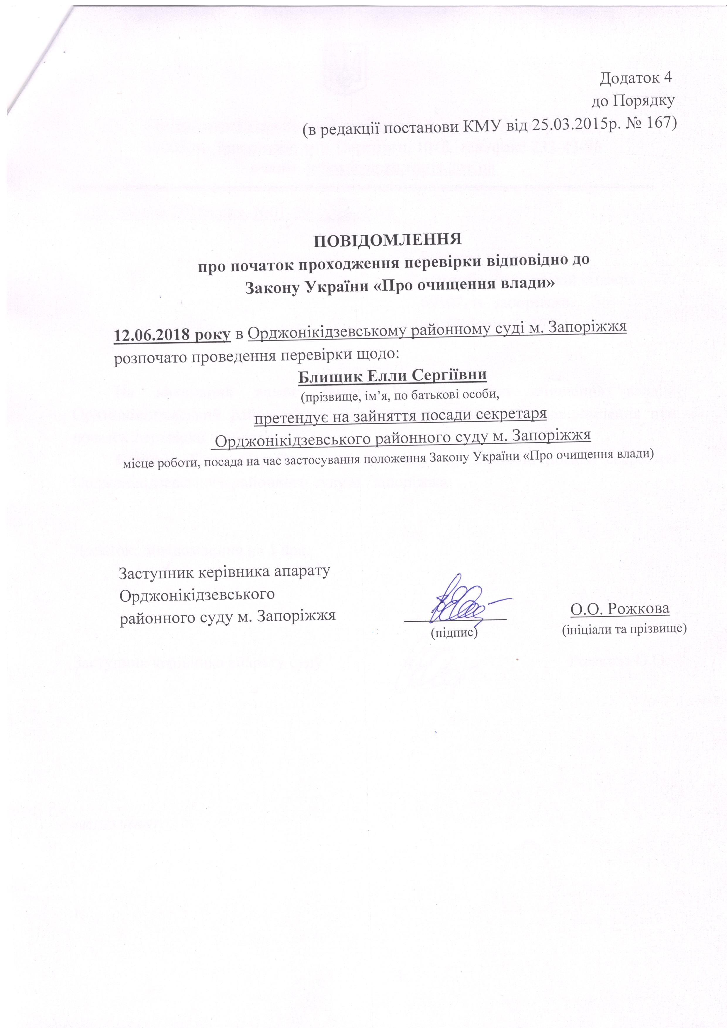 ПОВІДОМЛЕННЯ про початок перевірки відповідно до ЗУ "Про очищення влади" - Блищик Елла Сергіївна
