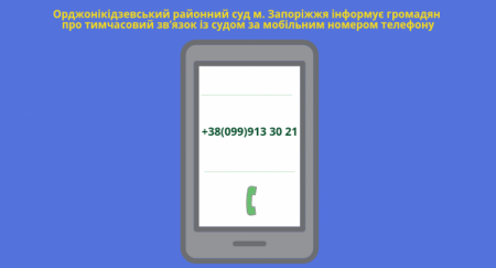 Звертаємо вашу увагу, що зазначений телефонний номер доступний для дзвінків у робочі дні згідно до розкладу роботи суду, до відновлення роботи стаціонарних телефонних номерів Орджонікідзевського районного суду м. Запоріжжя.