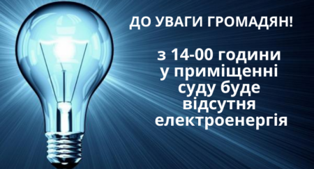 За повідомленням Територіального управління Державної судової адміністрації сьогодні, 29 травня 2019 року, після 14 години і до закінчення робочого часу в приміщенні суду буде відключено електропостачання.