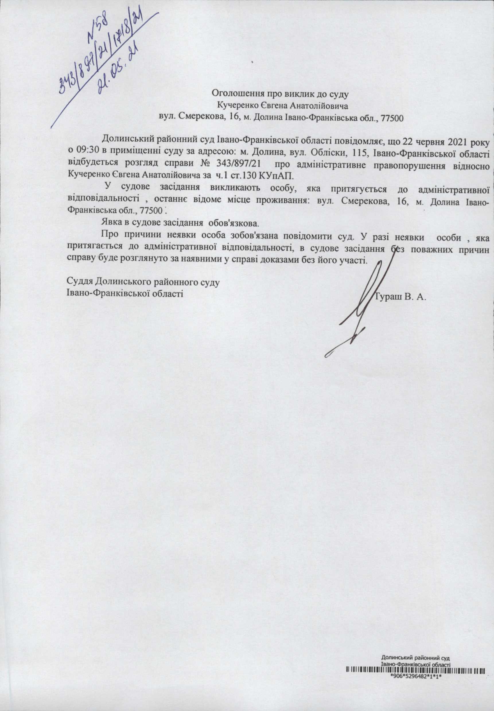 ОГОЛОШЕННЯ ПРО ВИКЛИК до СУДУ Кучеренко Євгена Анатолійовича у справі про адміністративне правопорушення № 343/895/21