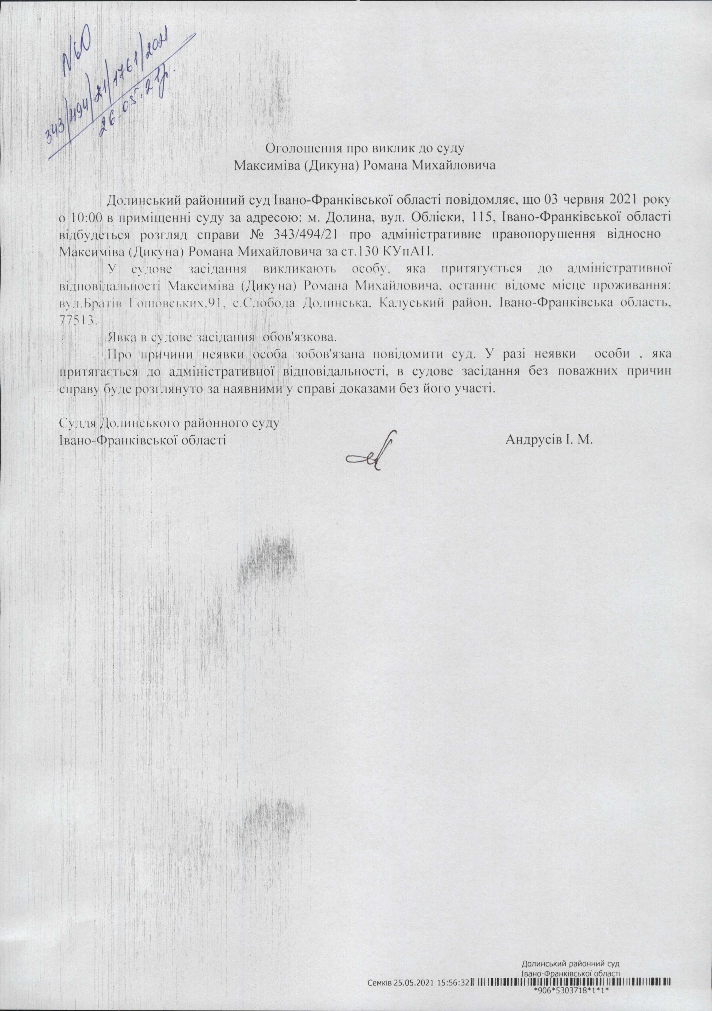 ОГОЛОШЕННЯ ПРО ВИКЛИК до СУДУ Максиміва (Дикуна) Романа Михайловича у справі про адміністративне правопорушення №343/494/21