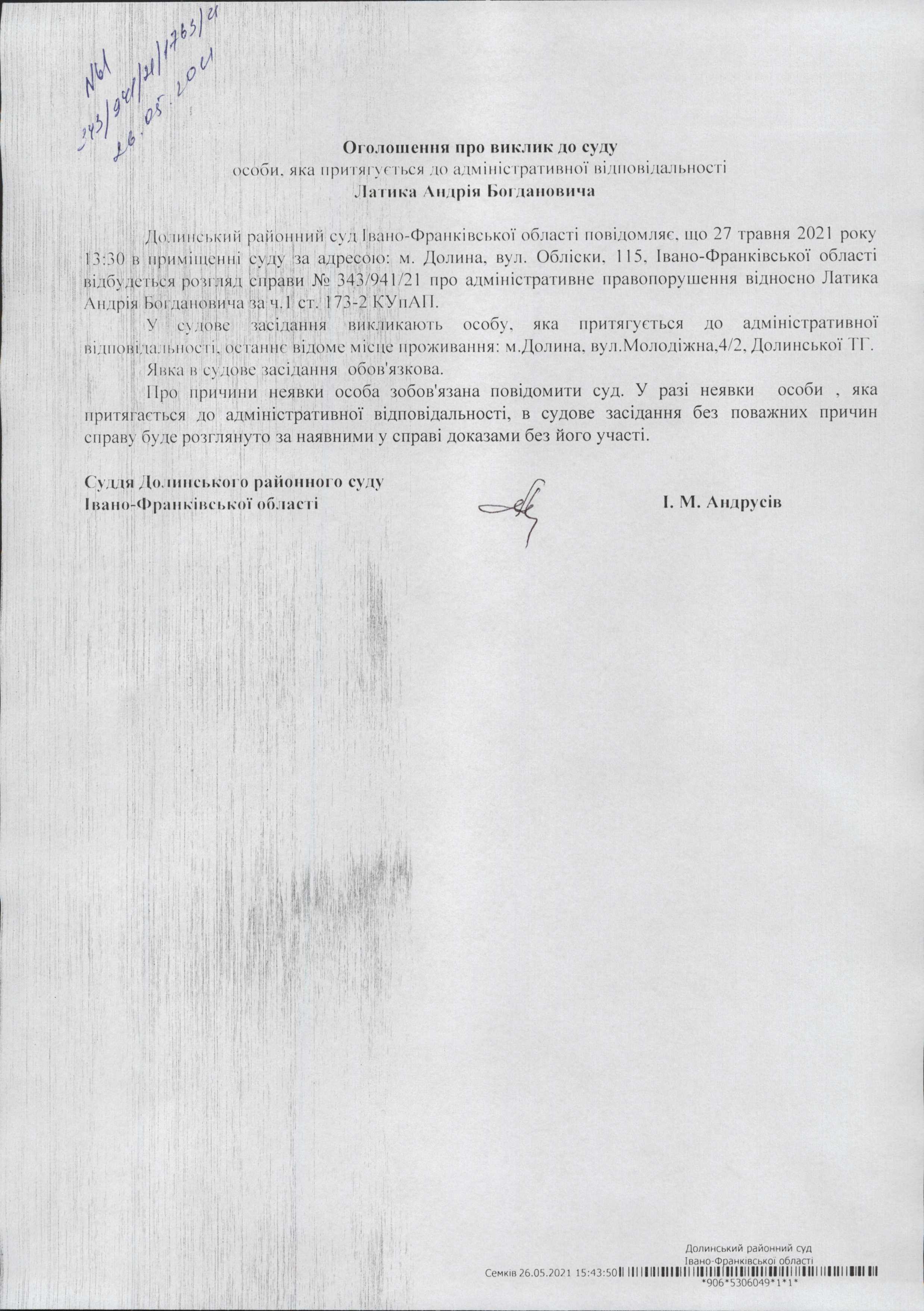 ОГОЛОШЕННЯ ПРО ВИКЛИК до СУДУ Латика Андрія Богдановича у справі про адміністративне правопорушення № 343/941/21